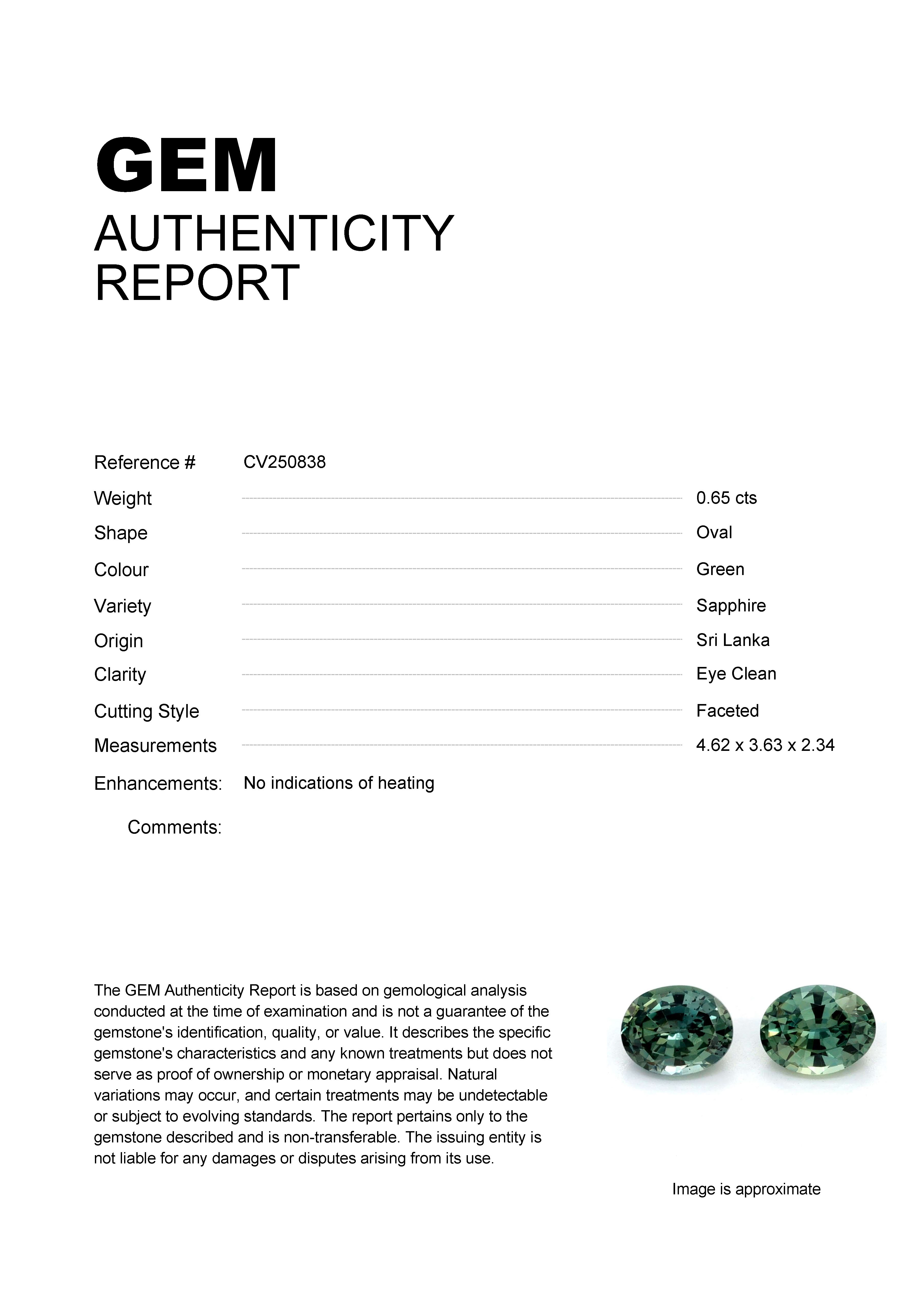 0.65ct Green Oval Sri Lanka SapphireCarat: 0.65 ctType: SapphireCut: OvalColour: GreenOrigin: Sri LankaComment: Not Heated4.62 x 3.63 x 2.34 mm