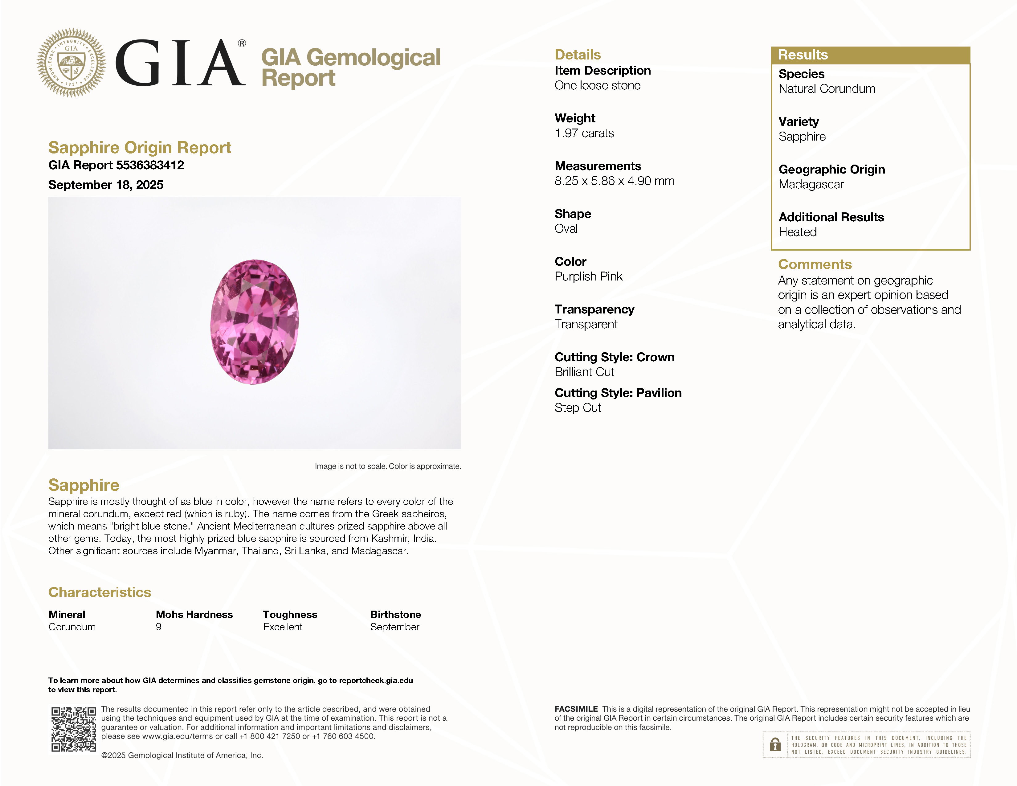 GIA: 5536383412 Stock ID: MSV2508121.97ct Pink Oval Madagascar SapphireCarat: 1.97 ctType: SapphireCut: OvalColour: PinkOrigin: MadagascarComment: Heated8.25 x 5.86 x 4.90 mm