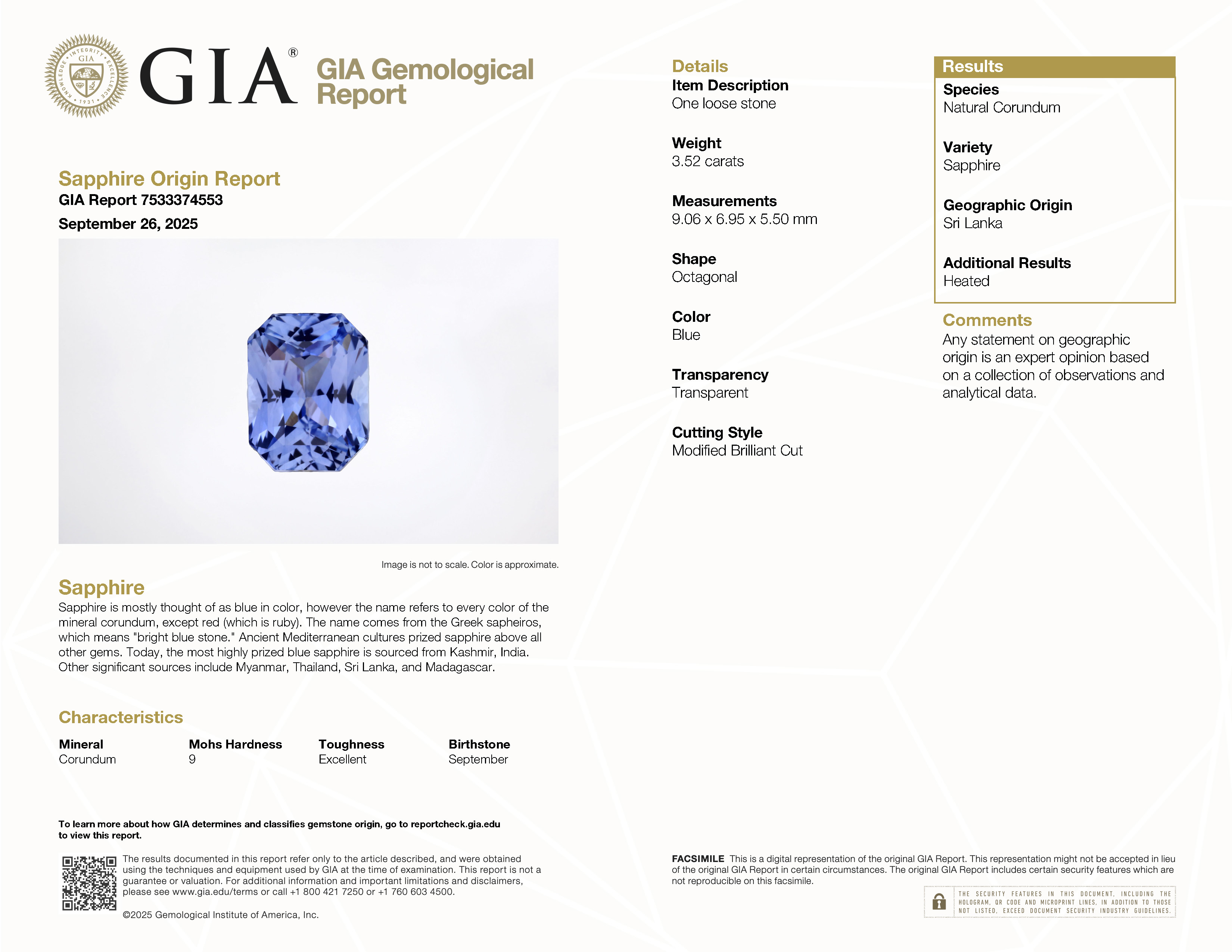 GIA: 7533374553 Stock ID: CD2508073.53ct Blue Radiant Sri Lanka SapphireCarat: 3.53 ctType: SapphireCut: RadiantColour: BlueOrigin: Sri LankaComment: Heated9.06 x 6.96 x 5.50 mm