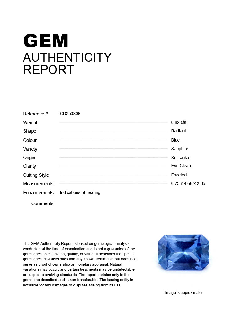 0.82ct Blue Radiant Sri Lanka SapphireCarat: 0.82 ctType: SapphireCut: RadiantColour: BlueOrigin: Sri LankaComment: Heated6.75 x 4.68 x 2.85 mm