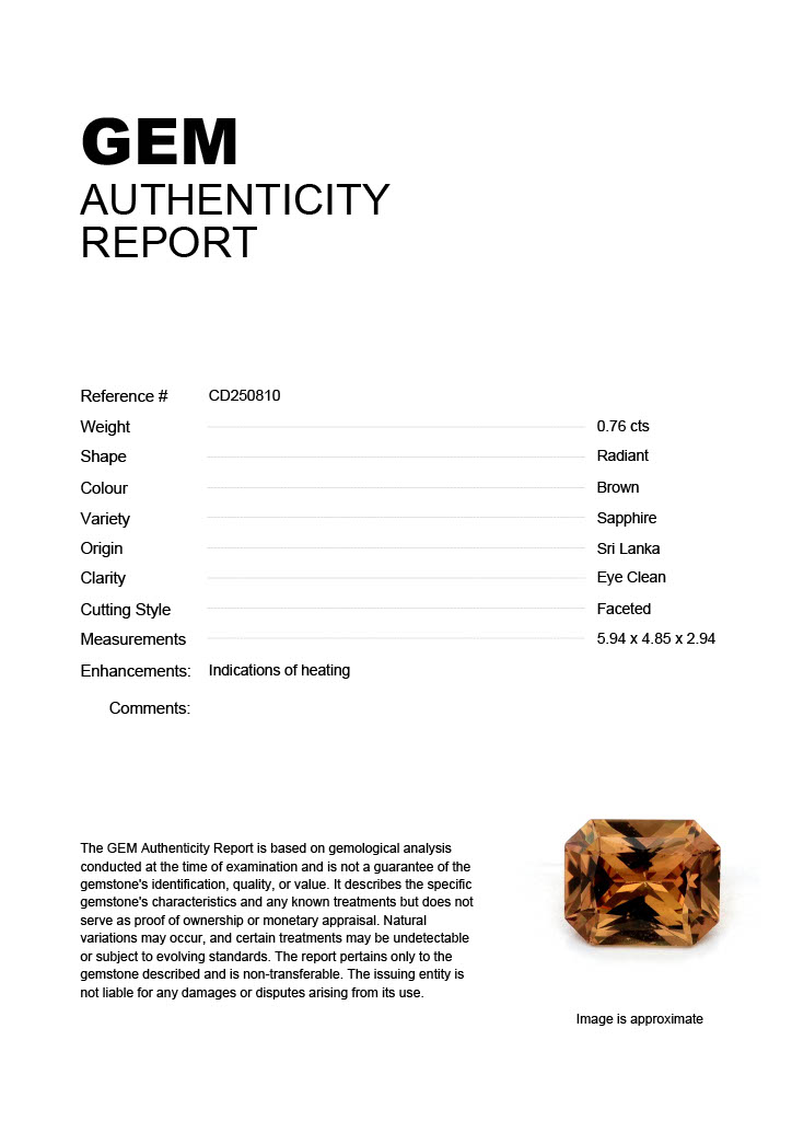 0.76ct Brown Radiant Sri Lanka SapphireCarat: 0.76 ctType: SapphireCut: RadiantColour: BrownOrigin: Sri LankaComment: Heated5.94 x 4.85 x 2.94 mm