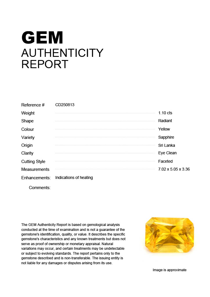 1.10ct Yellow Radiant Sri Lanka SapphireCarat: 1.10 ctType: SapphireCut: RadiantColour: YellowOrigin: Sri LankaComment: Heated7.02 x 5.05 x 3.36 mm