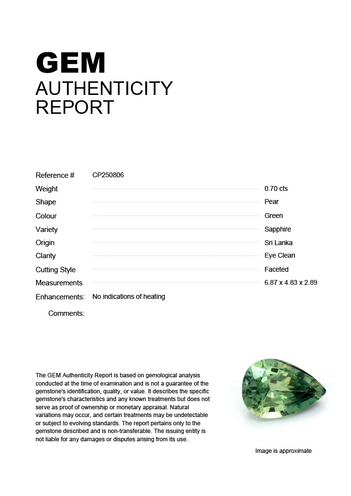 0.70ct Green Pear Sri Lanka SapphireCarat: 0.70 ctType: SapphireCut: PearColour: GreenOrigin: Sri LankaComment: Not Heated6.87 x 4.83 x 2.89 mm