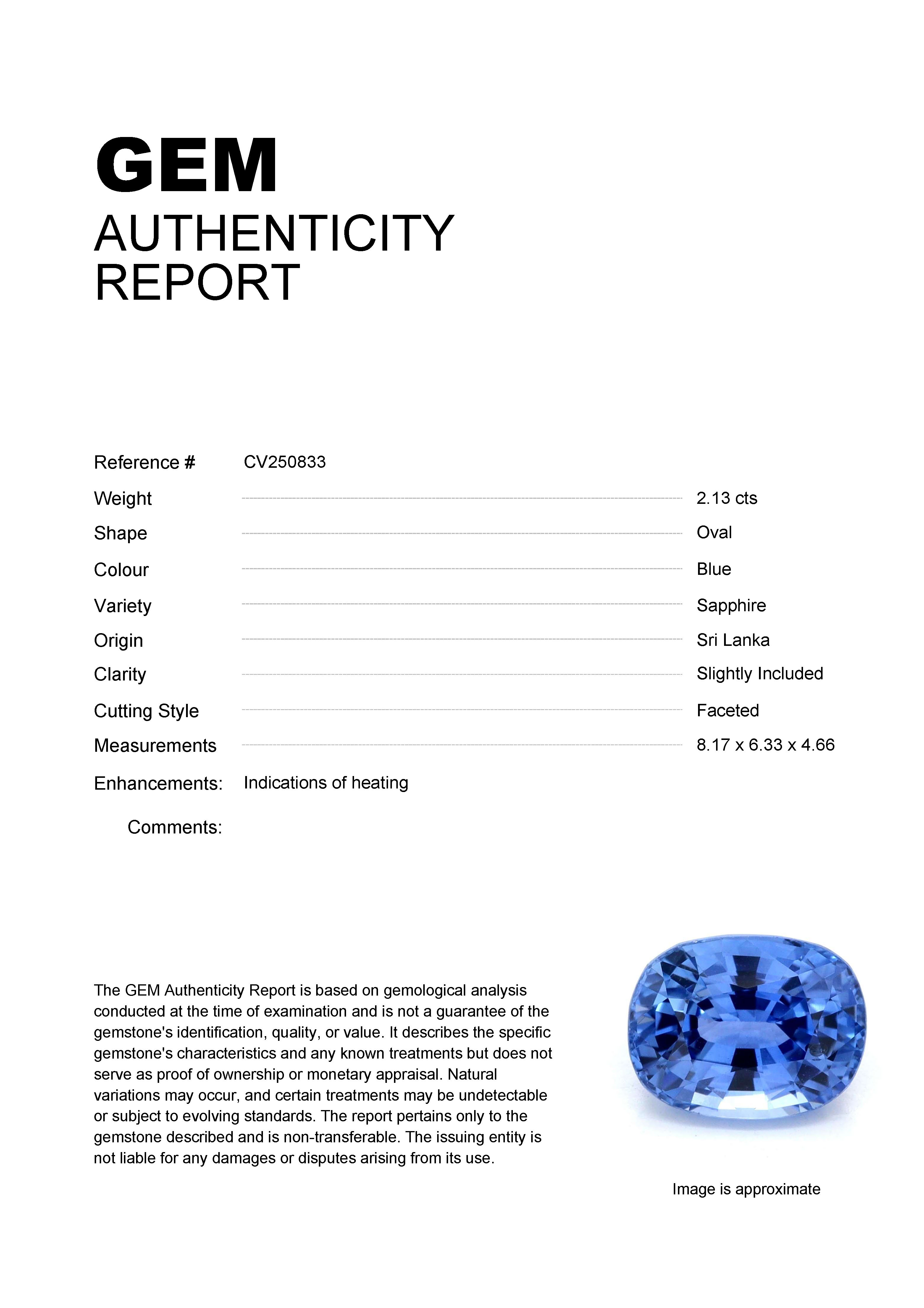 2.13ct Blue Oval Sri Lanka SapphireCarat: 2.13 ctType: SapphireCut: OvalColour: BlueOrigin: Sri LankaComment: Heated8.17 x 6.33 x 4.66 mm
