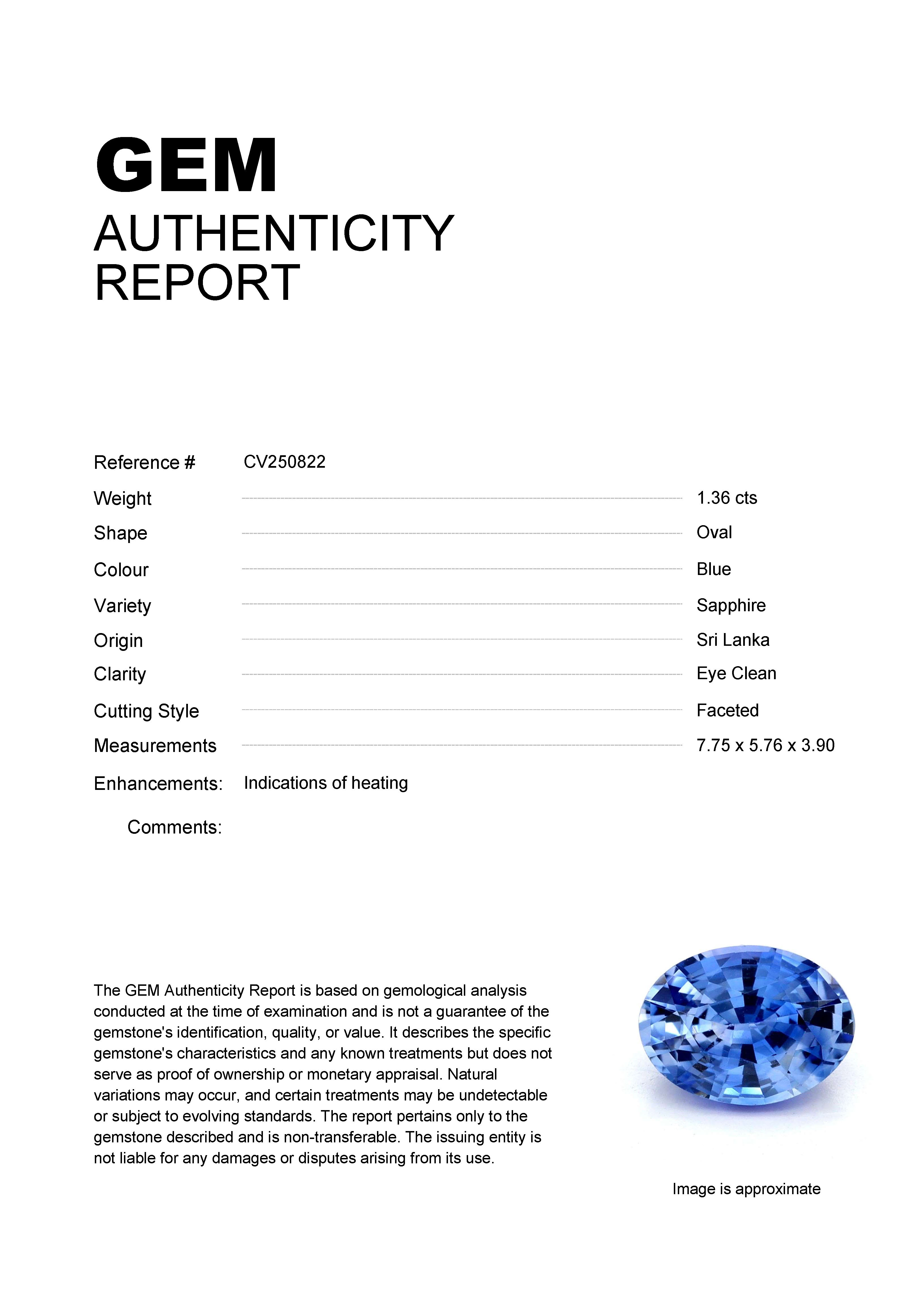 1.36ct Blue Oval Sri Lanka SapphireCarat: 1.36 ctType: SapphireCut: OvalColour: BlueOrigin: Sri LankaComment: Heated7.75 x 5.76 x 3.90 mm