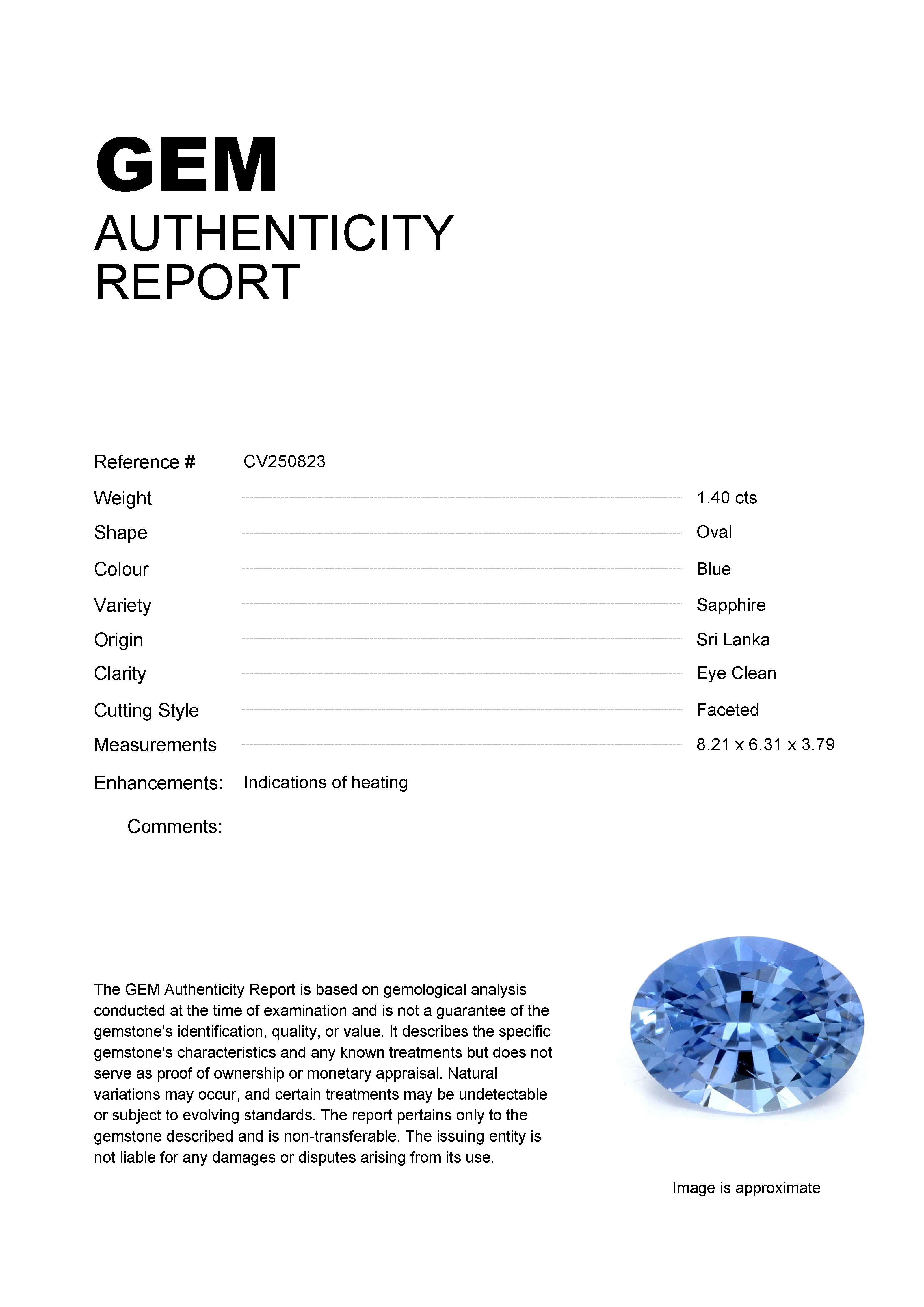 1.40ct Blue Oval Sri Lanka SapphireCarat: 1.40 ctType: SapphireCut: OvalColour: BlueOrigin: Sri LankaComment: Heated8.21 x 6.31 x 3.79 mm