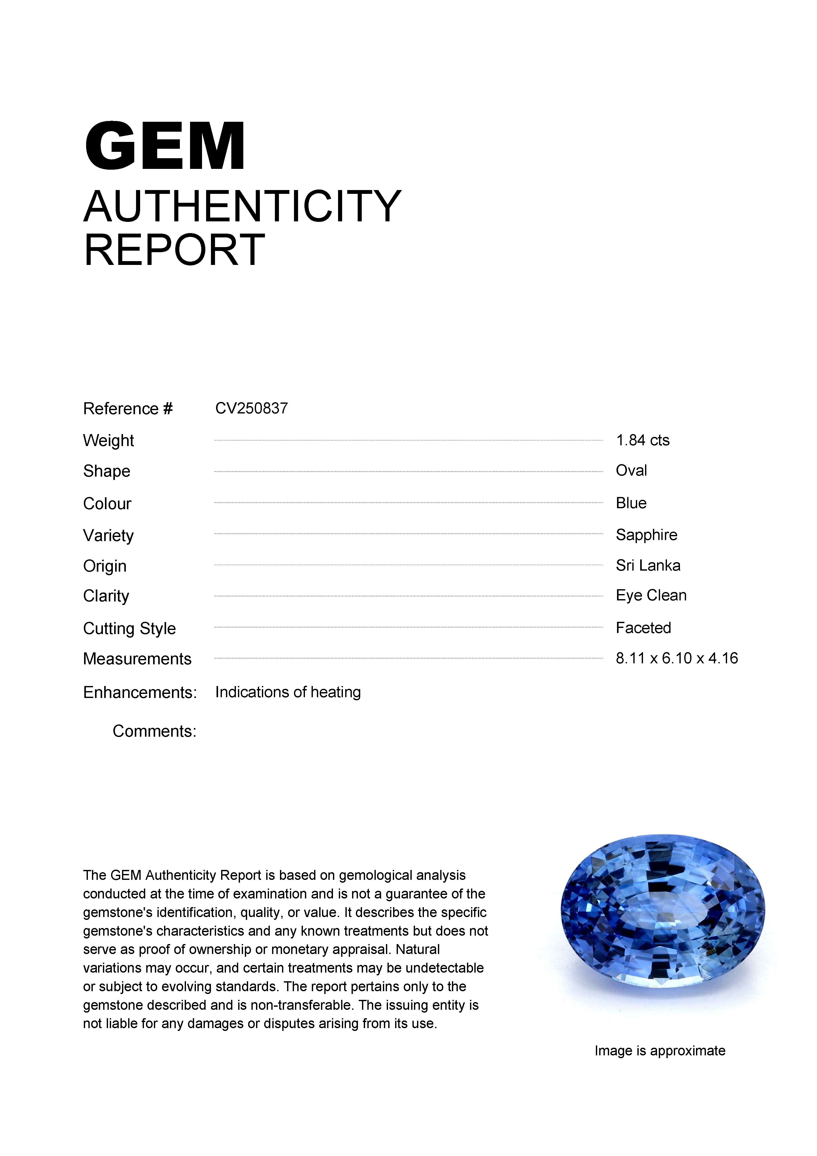 1.84ct Blue Oval Sri Lanka SapphireCarat: 1.84 ctType: SapphireCut: OvalColour: BlueOrigin: Sri LankaComment: Heated8.11 x 6.10 x 4.16 mm
