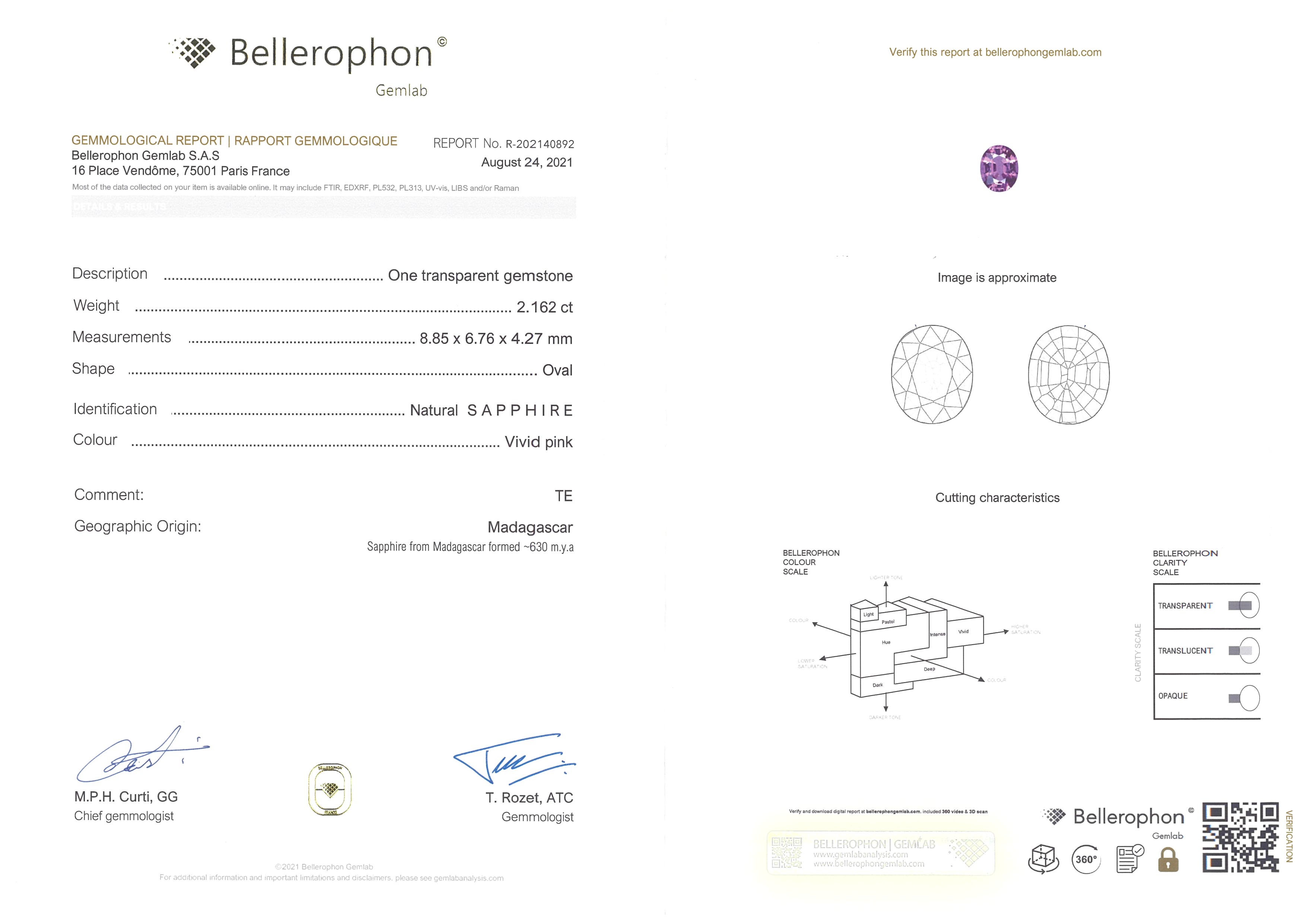 Bellerophon: R-202140892 Stock ID: MSV2508082.16ct Pink Oval Madagascar SapphireCarat: 2.16 ctType: SapphireCut: OvalColour: PinkOrigin: MadagascarComment: Heated8.85 x 6.76 x 4.27 mm