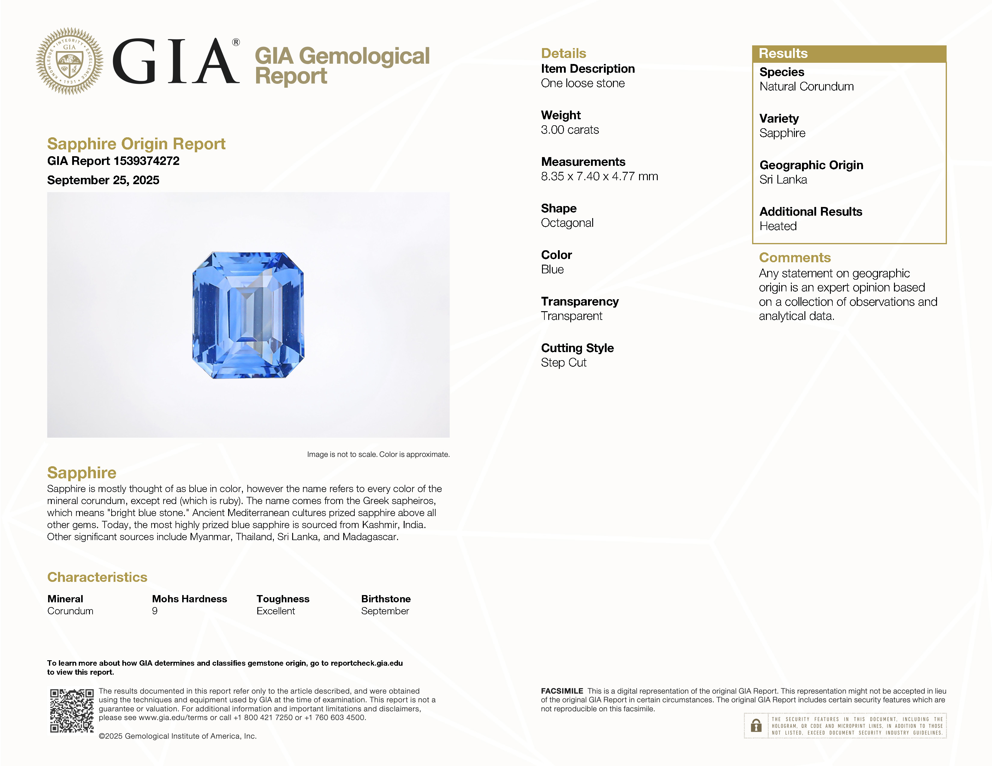 GIA: 1539374272 Stock ID: CE2508023.00ct Blue Emerald Sri Lanka SapphireCarat: 3.00 ctType: SapphireCut: EmeraldColour: BlueOrigin: Sri LankaComment: Heated8.35 x 7.40 x 4.77 mm