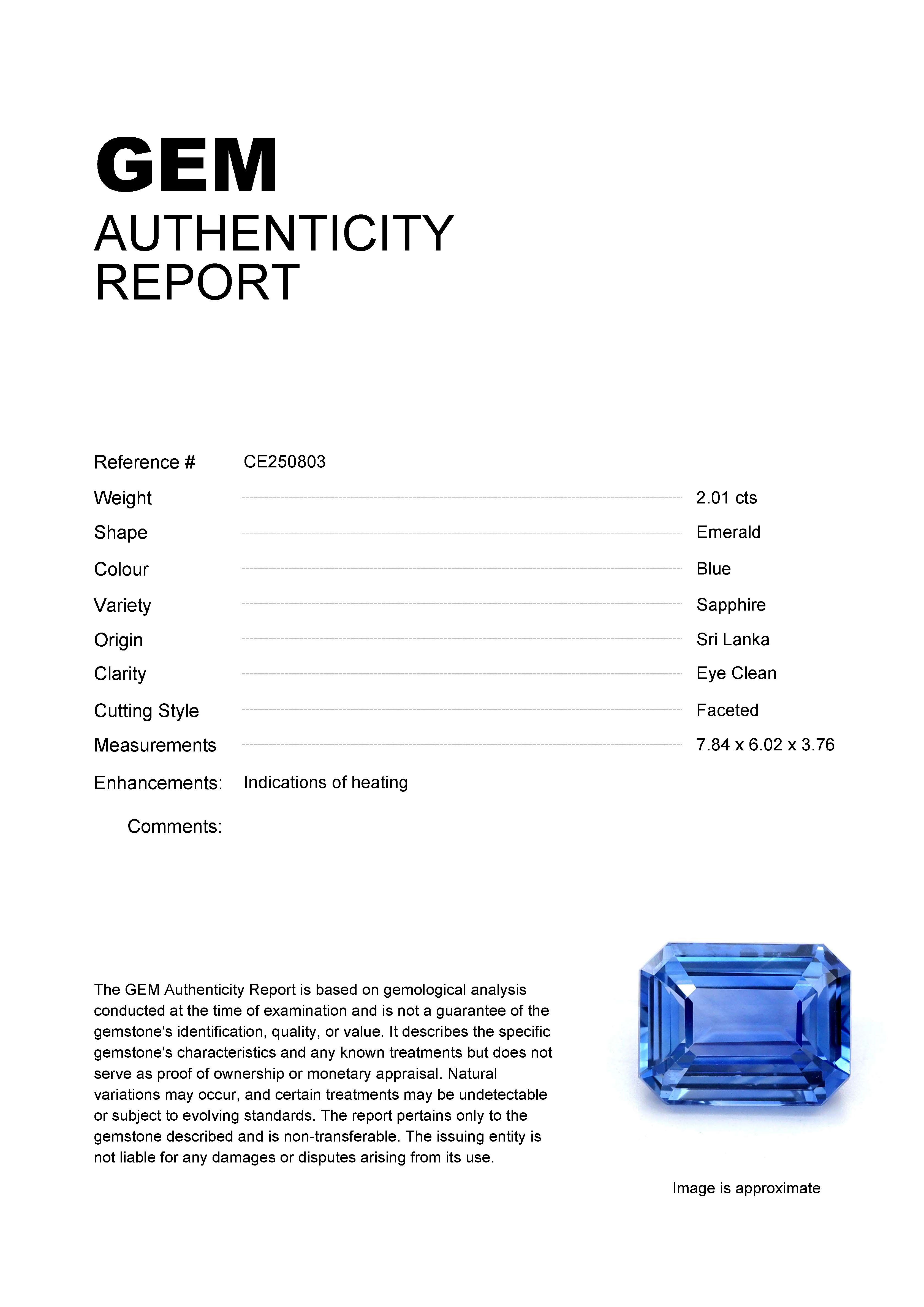 2.01ct Blue Emerald Sri Lanka SapphireCarat: 2.01 ctType: SapphireCut: EmeraldColour: BlueOrigin: Sri LankaComment: Heated7.84 x 6.02 x 3.76 mm