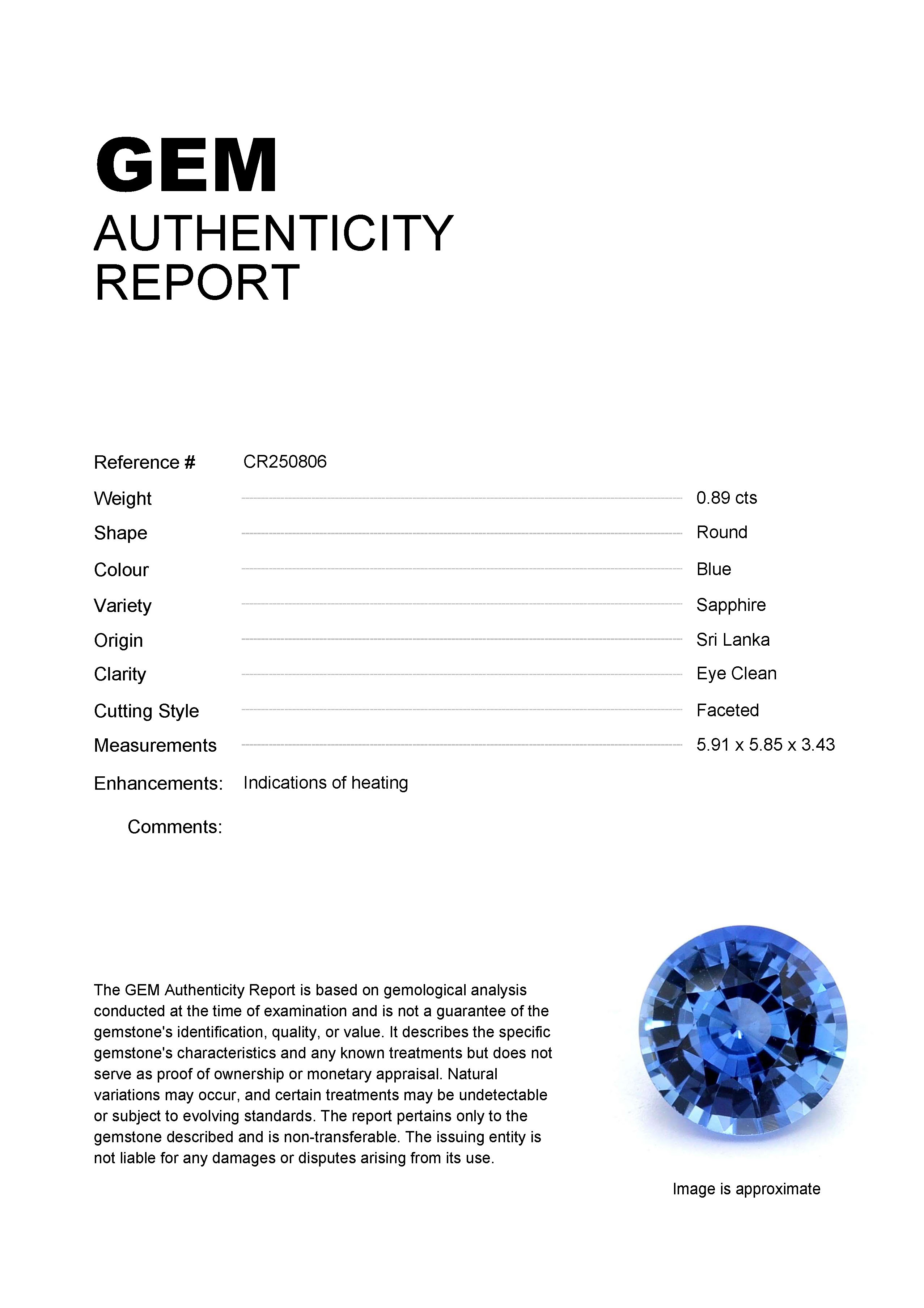 0.89ct Blue Round Sri Lanka SapphireCarat: 0.89 ctType: SapphireCut: RoundColour: BlueOrigin: Sri LankaComment: Heated5.91 x 5.85 x 3.43 mm