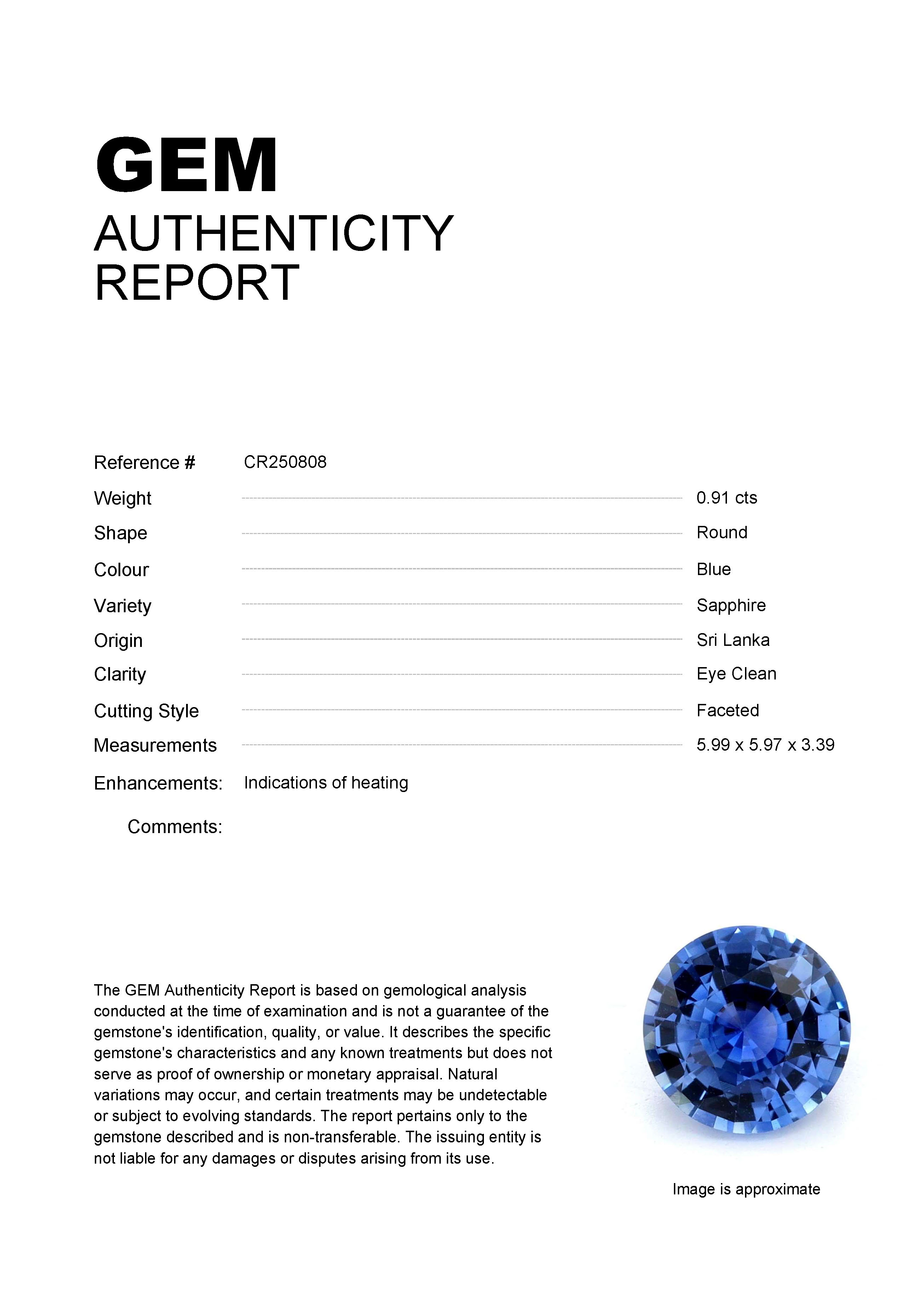 0.91ct Blue Round Sri Lanka SapphireCarat: 0.91 ctType: SapphireCut: RoundColour: BlueOrigin: Sri LankaComment: Heated5.99 x 5.97 x 3.39 mm