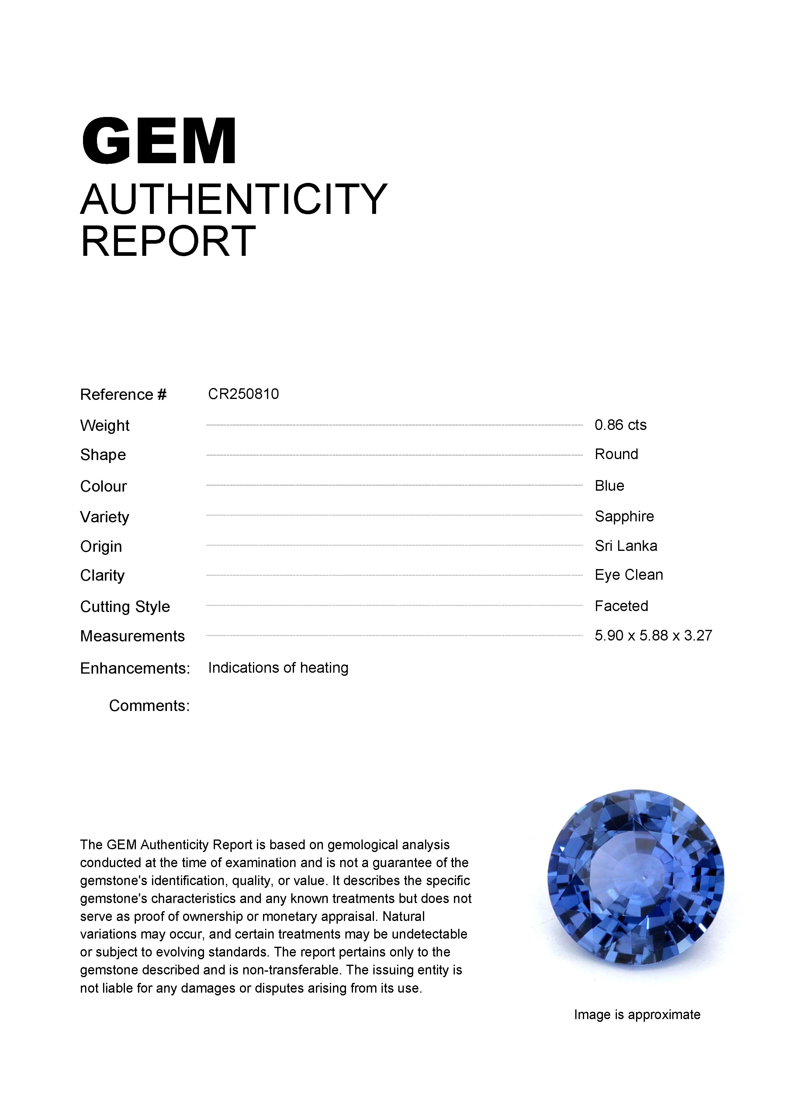 0.86ct Blue Round Sri Lanka SapphireCarat: 0.86 ctType: SapphireCut: RoundColour: BlueOrigin: Sri LankaComment: Heated5.90 x 5.88 x 3.27 mm