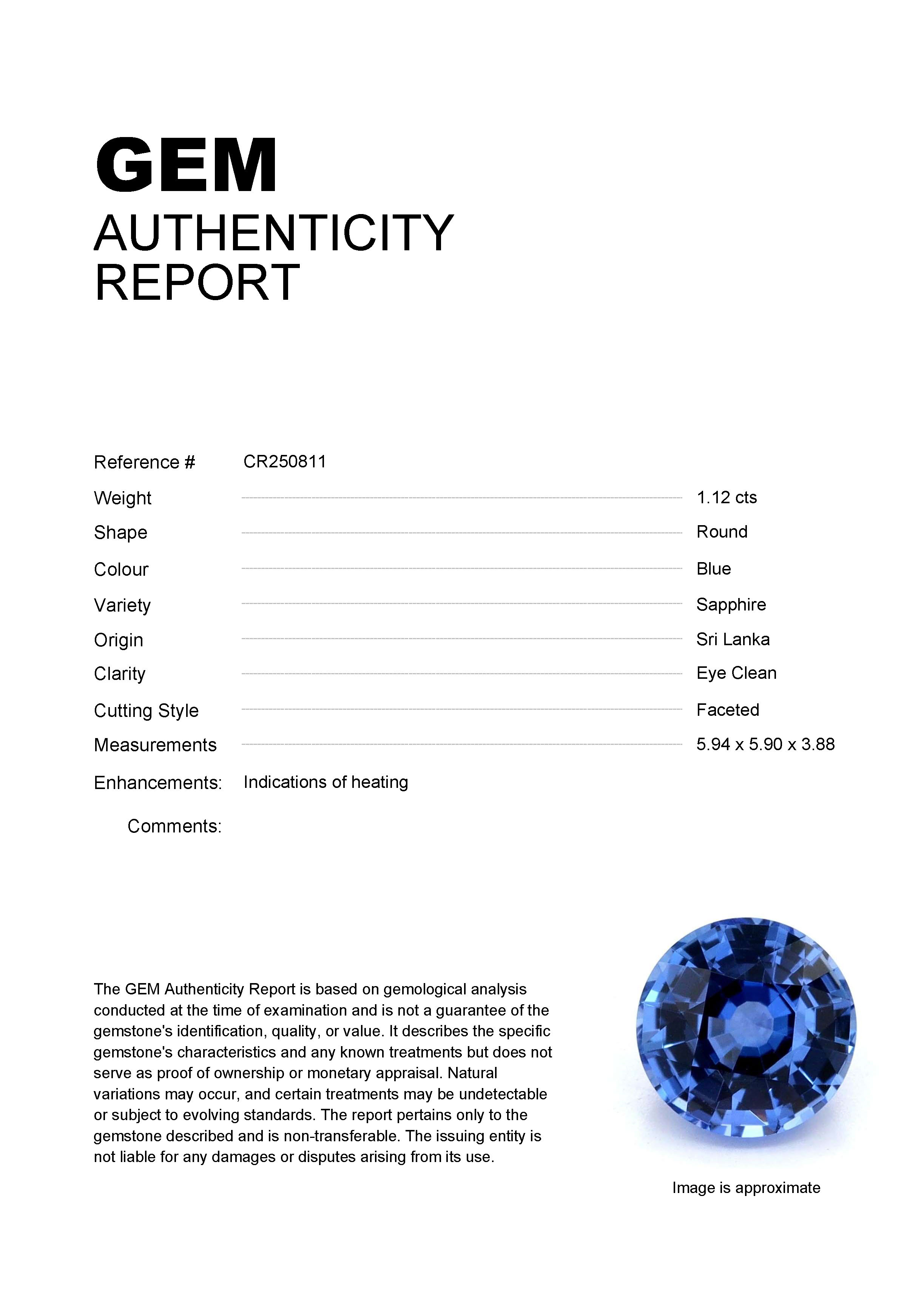 1.12ct Blue Round Sri Lanka SapphireCarat: 1.12 ctType: SapphireCut: RoundColour: BlueOrigin: Sri LankaComment: Heated5.94 x 5.90 x 3.88 mm