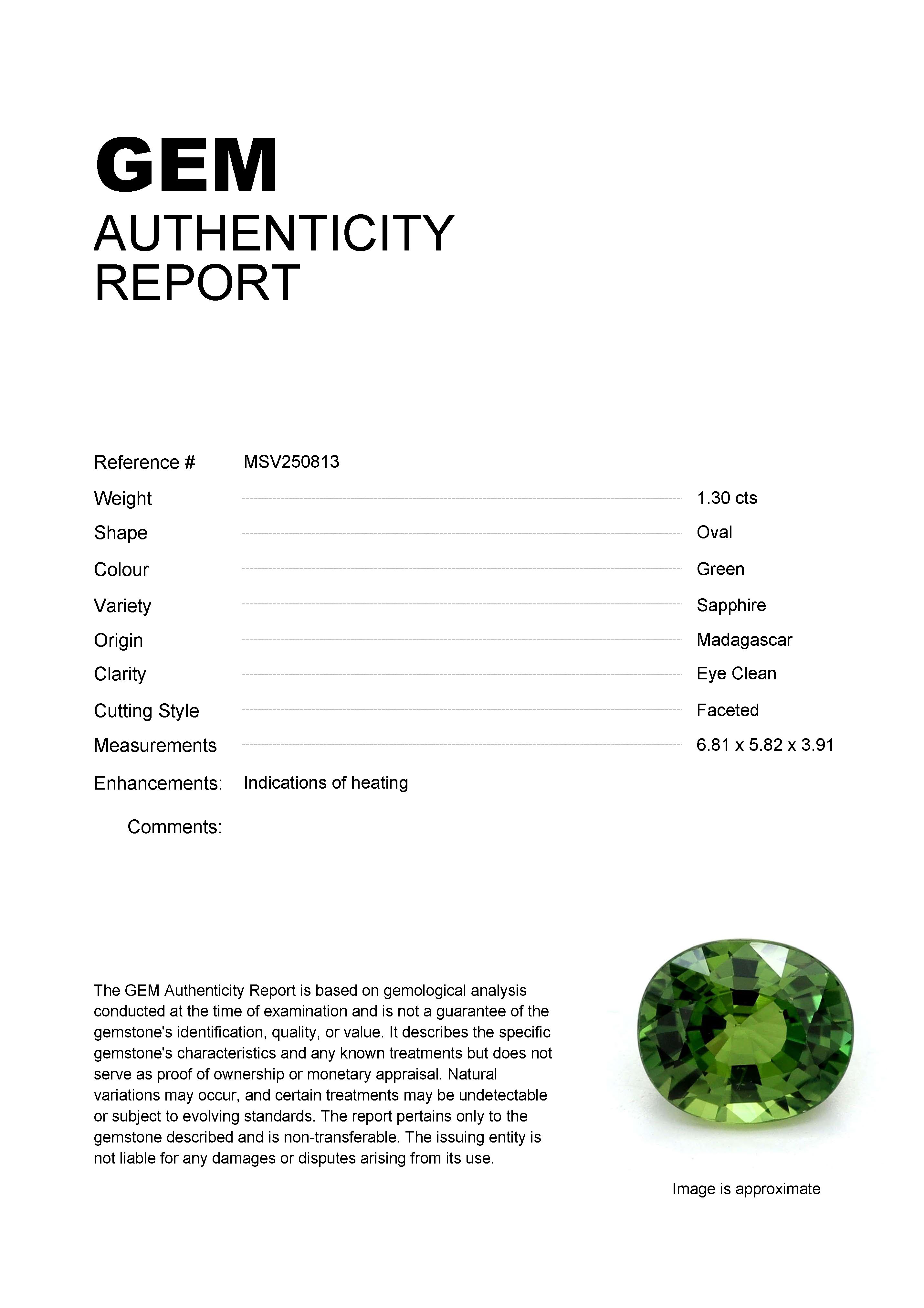 1.30ct Green Oval Madagascar SapphireCarat: 1.30 ctType: SapphireCut: OvalColour: GreenOrigin: MadagascarComment: Heated6.81 x 5.82 x 3.91 mm