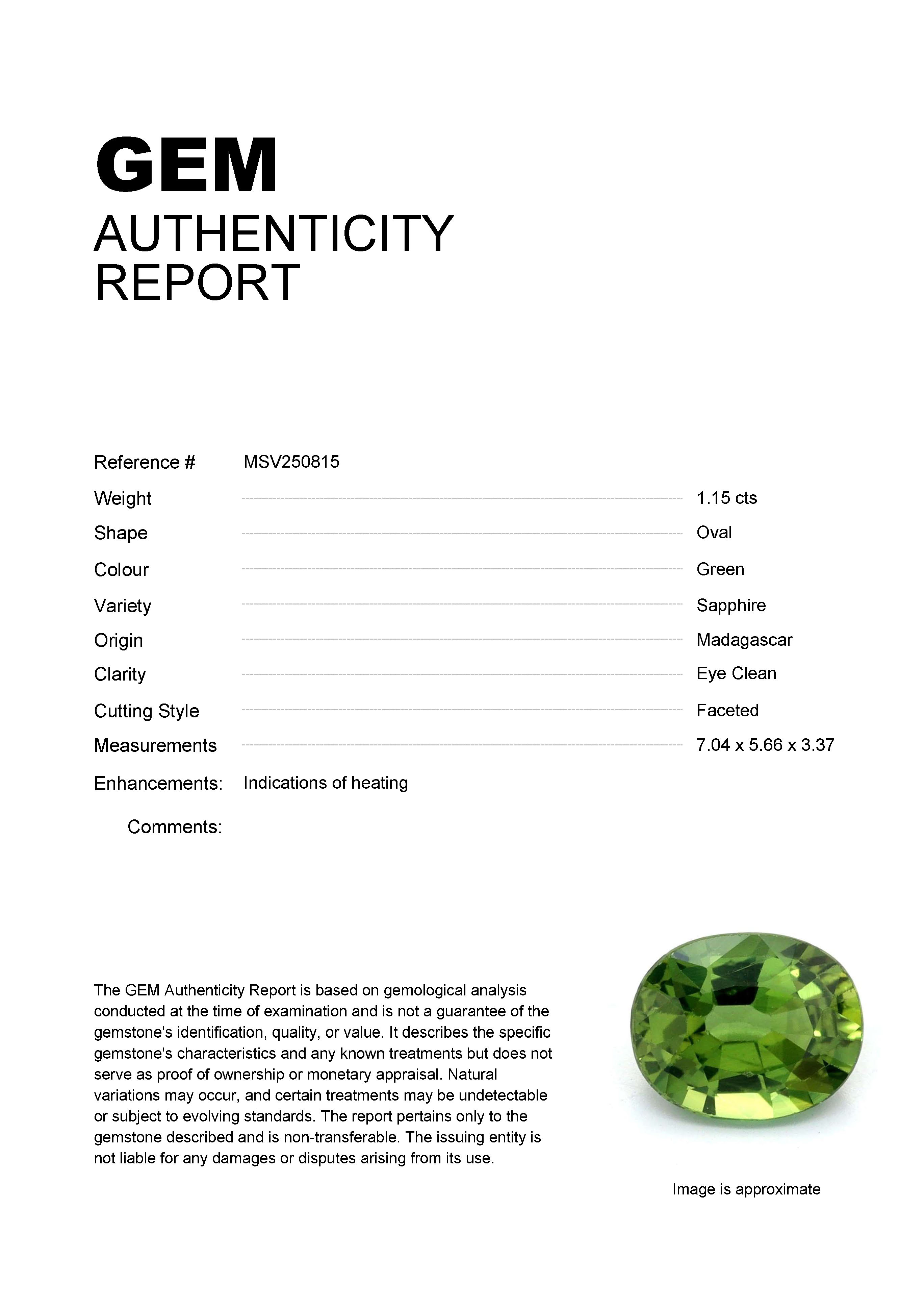 1.15ct Green Oval Madagascar SapphireCarat: 1.15 ctType: SapphireCut: OvalColour: GreenOrigin: MadagascarComment: Heated7.04 x 5.66 x 3.37 mm