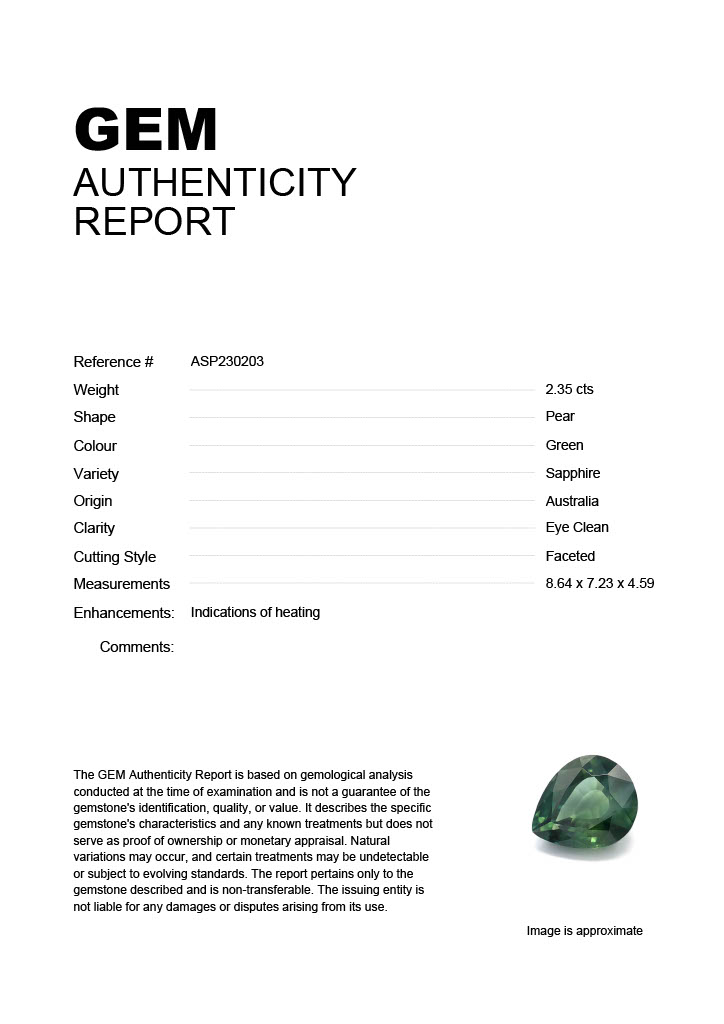 GEM: Stock ID: ASP2302032.35ct Green Pear Australia SapphireCarat: 2.35 ctType: SapphireCut: PearColour: GreenOrigin: AustraliaComment: Heated8.64 x 7.23 x 4.59 mm