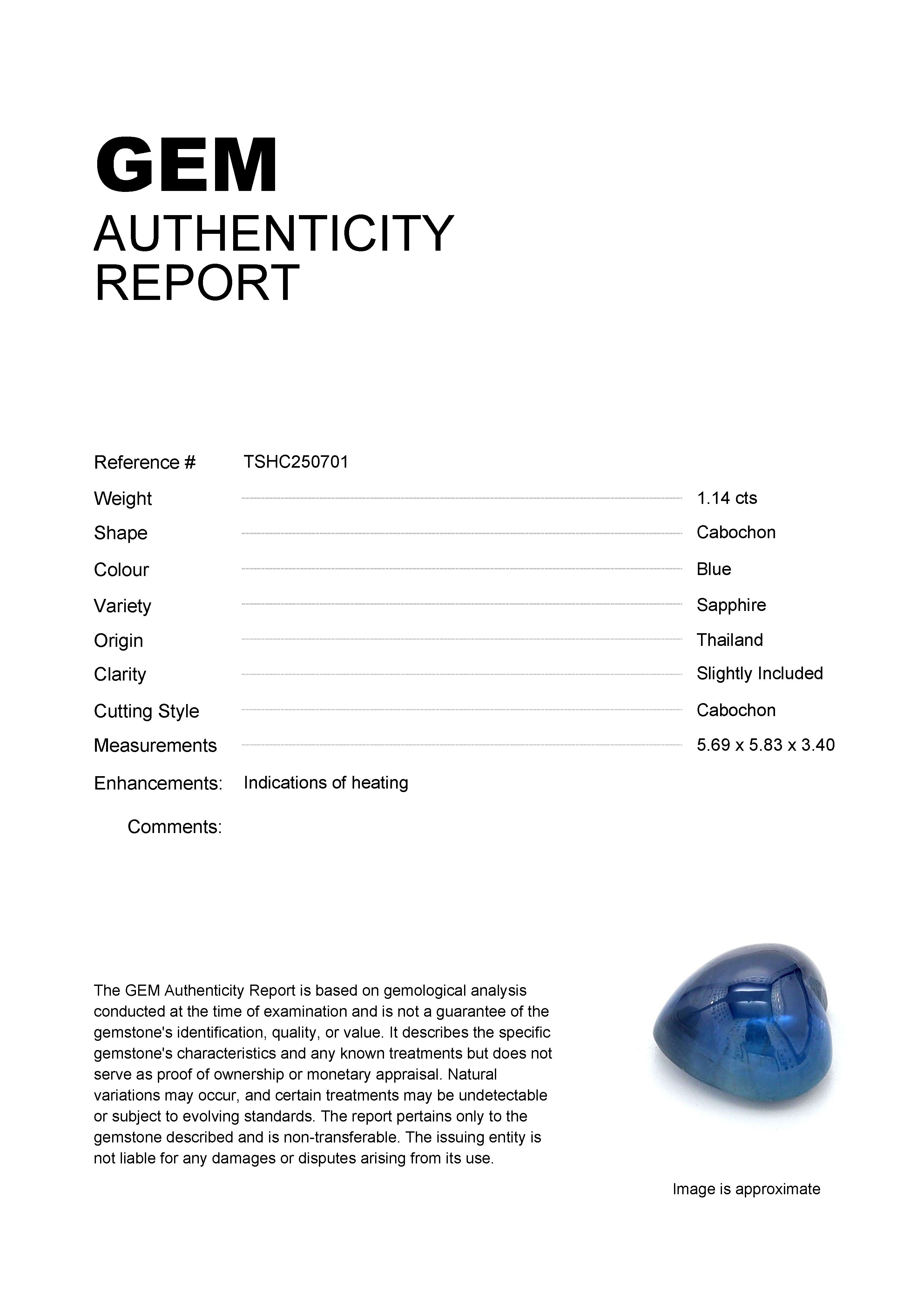 GEM: TSHC250701 Stock ID: TSHC2507011.14ct Blue Cabochon Thailand SapphireCarat: 1.14 ctType: SapphireCut: CabochonColour: BlueOrigin: ThailandComment: Heated5.69 x 5.83 x 3.40 mm