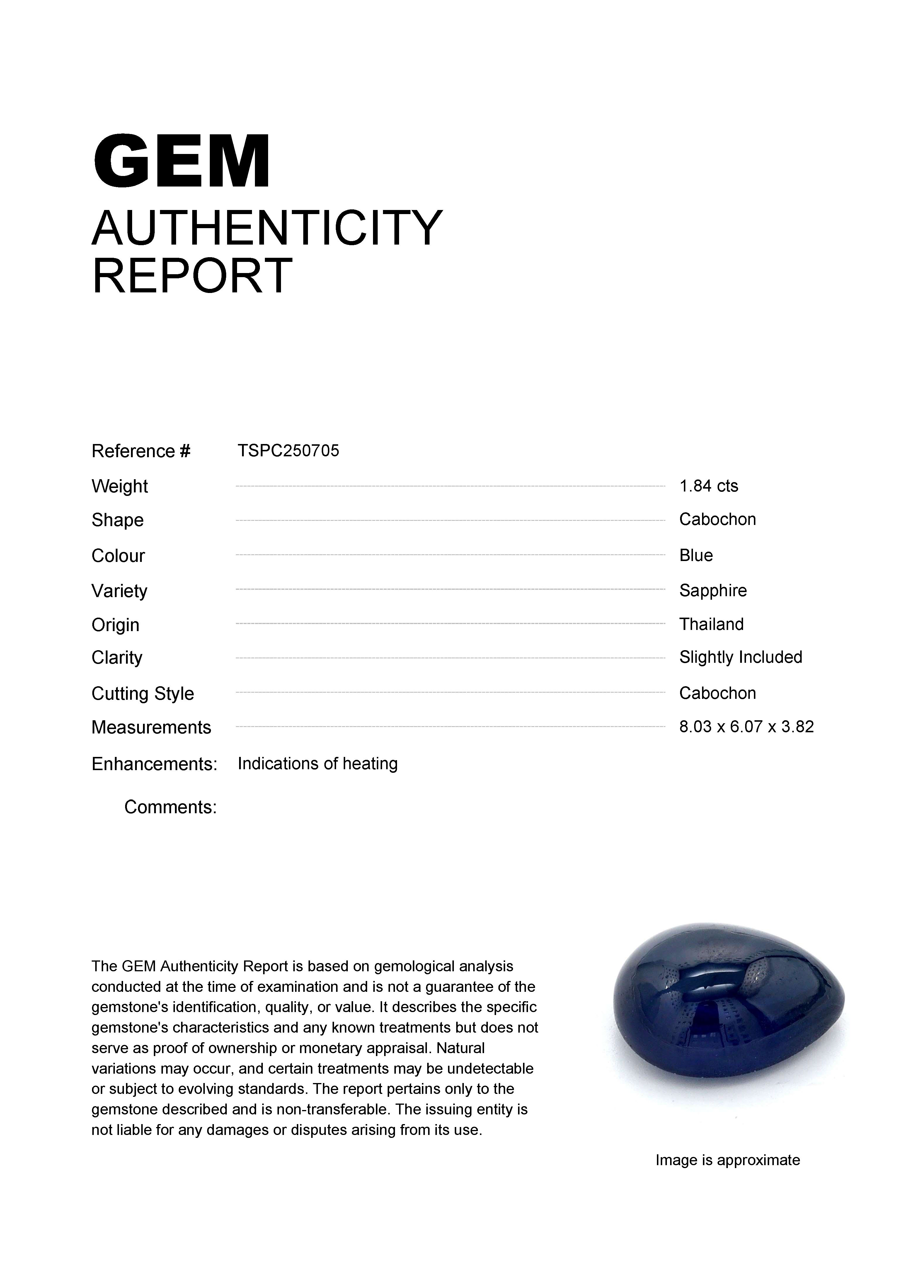 GEM: TSPC250705 Stock ID: TSPC2507051.84ct Blue Cabochon Thailand SapphireCarat: 1.84 ctType: SapphireCut: CabochonColour: BlueOrigin: ThailandComment: Heated8.03 x 6.07 x 3.82 mm