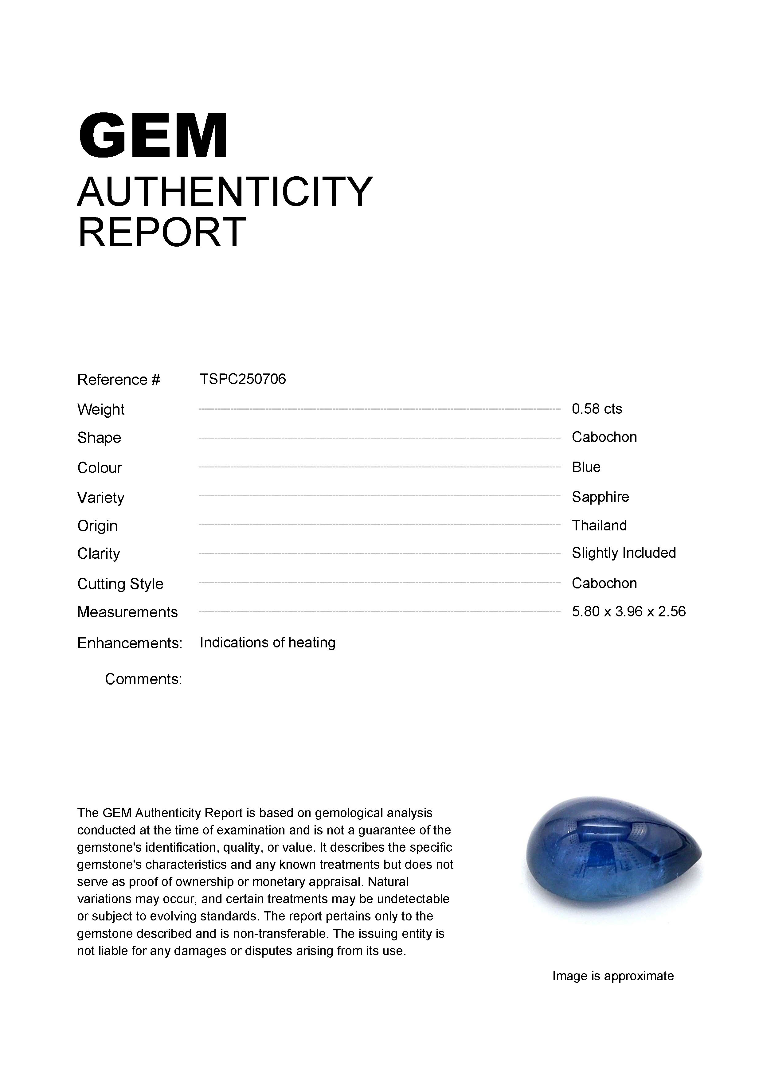 GEM: TSPC250706 Stock ID: TSPC2507060.58ct Blue Cabochon Thailand SapphireCarat: 0.58 ctType: SapphireCut: CabochonColour: BlueOrigin: ThailandComment: Heated5.80 x 3.96 x 2.56 mm