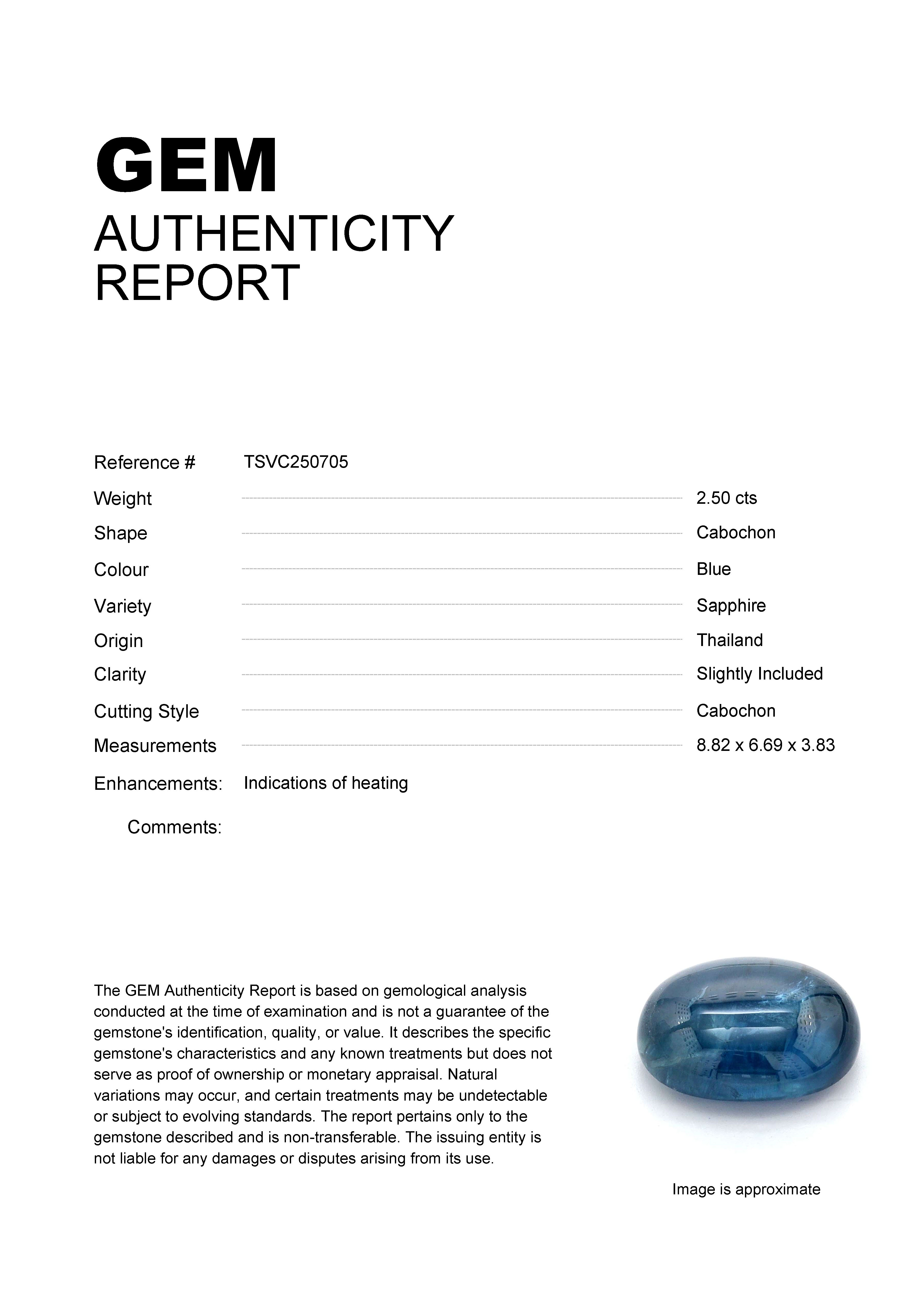 GEM: TSVC250705 Stock ID: TSVC2507052.50ct Blue Cabochon Thailand SapphireCarat: 2.50 ctType: SapphireCut: CabochonColour: BlueOrigin: ThailandComment: Heated8.82 x 6.69 x 3.83 mm