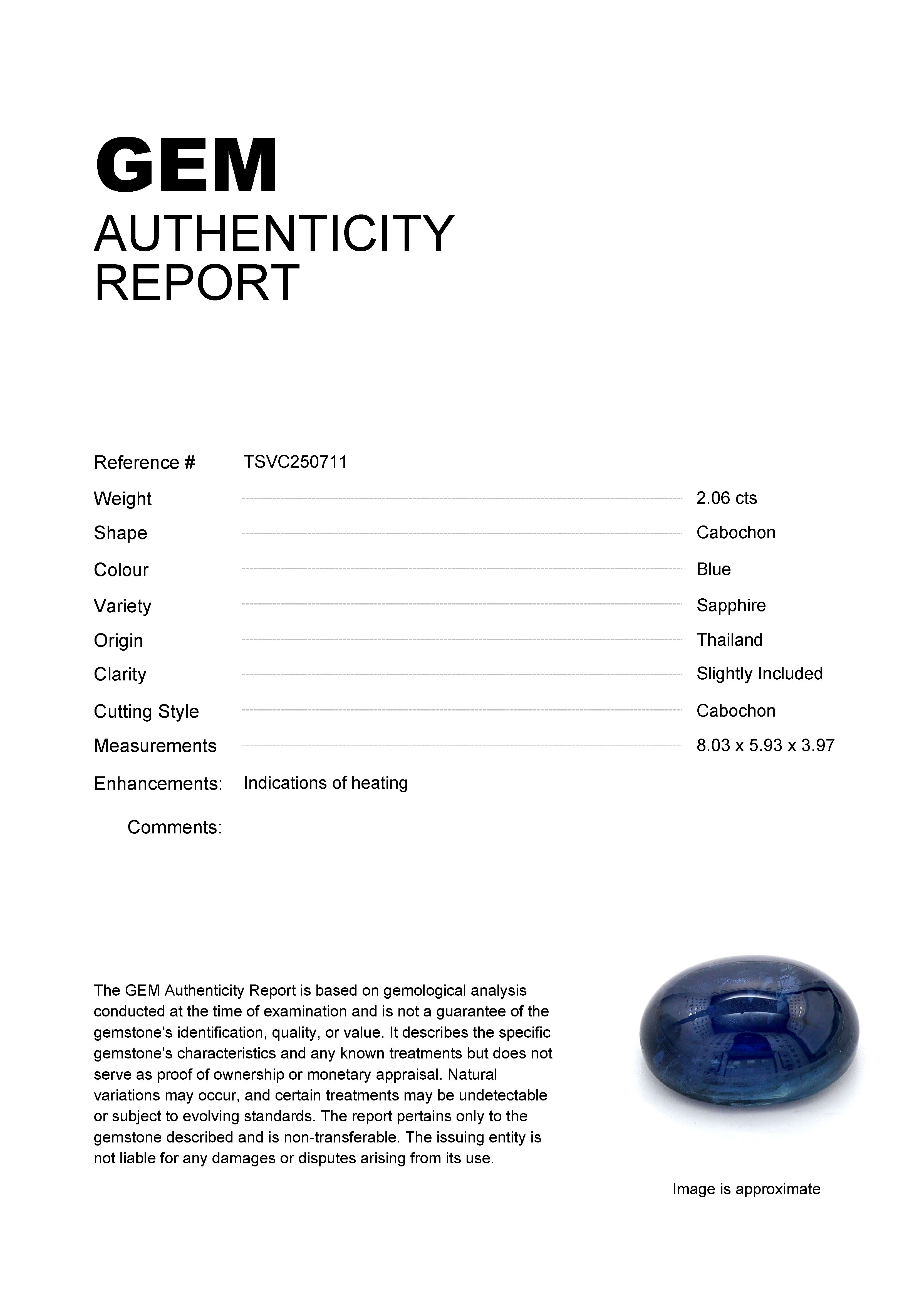 GEM: TSVC250711 Stock ID: TSVC2507112.06ct Blue Cabochon Thailand SapphireCarat: 2.06 ctType: SapphireCut: CabochonColour: BlueOrigin: ThailandComment: Heated8.03 x 5.93 x 3.97 mm