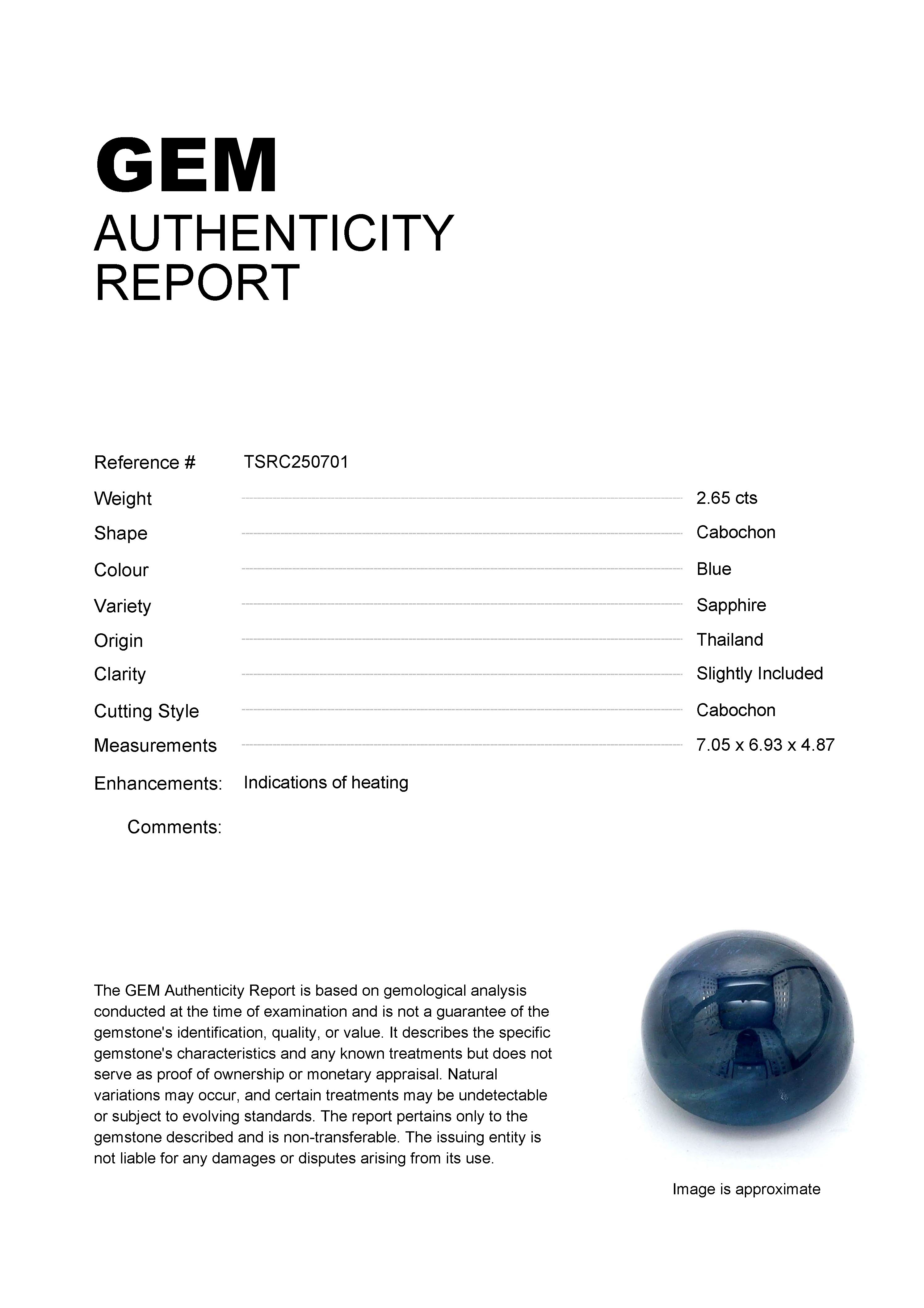 GEM: TSRC250701 Stock ID: TSRC2507012.65ct Blue Cabochon Thailand SapphireCarat: 2.65 ctType: SapphireCut: CabochonColour: BlueOrigin: ThailandComment: Heated7.05 x 6.93 x 4.87 mm