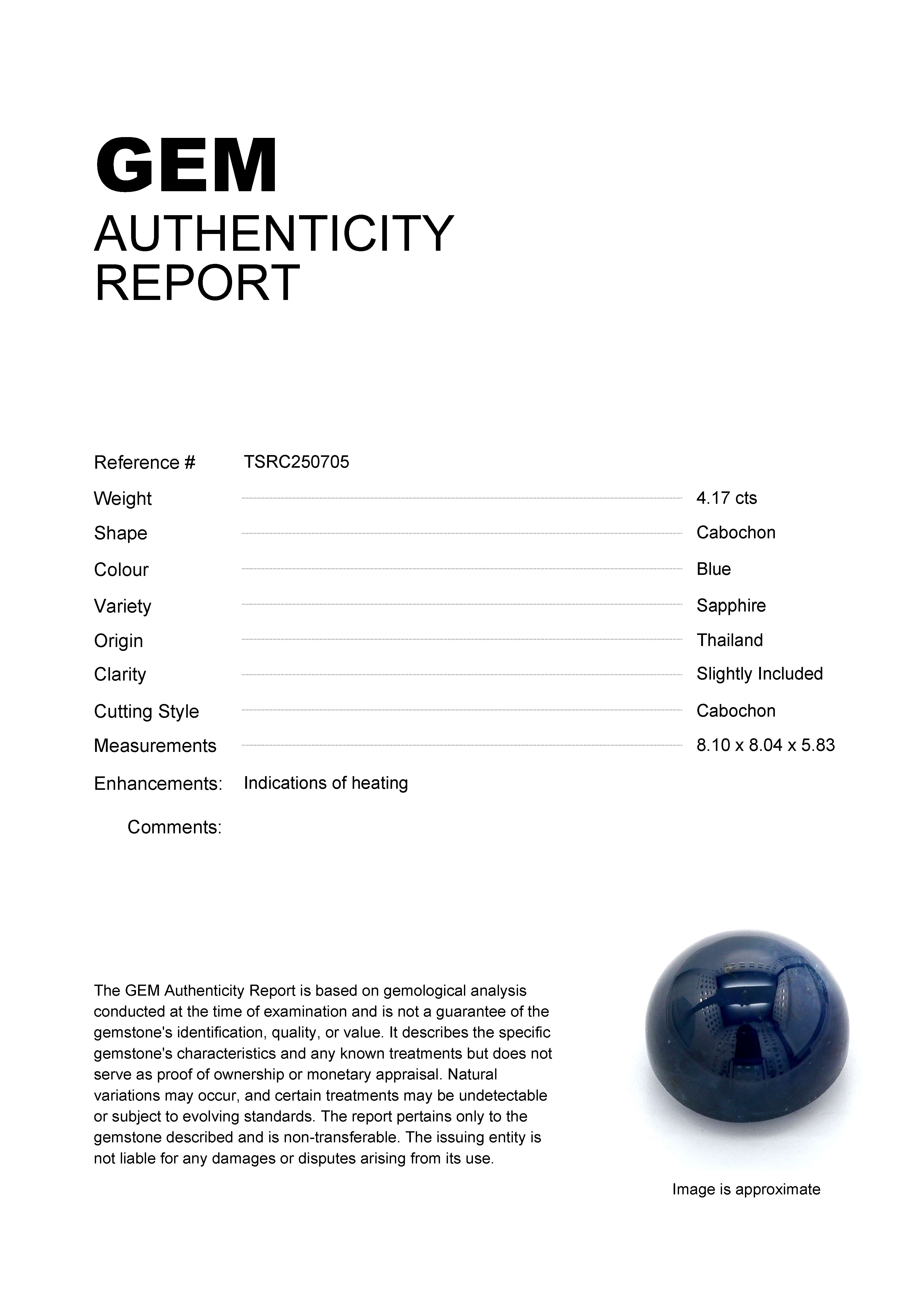 GEM: TSRC250705 Stock ID: TSRC2507054.17ct Blue Cabochon Thailand SapphireCarat: 4.17 ctType: SapphireCut: CabochonColour: BlueOrigin: ThailandComment: Heated8.10 x 8.04 x 5.83 mm