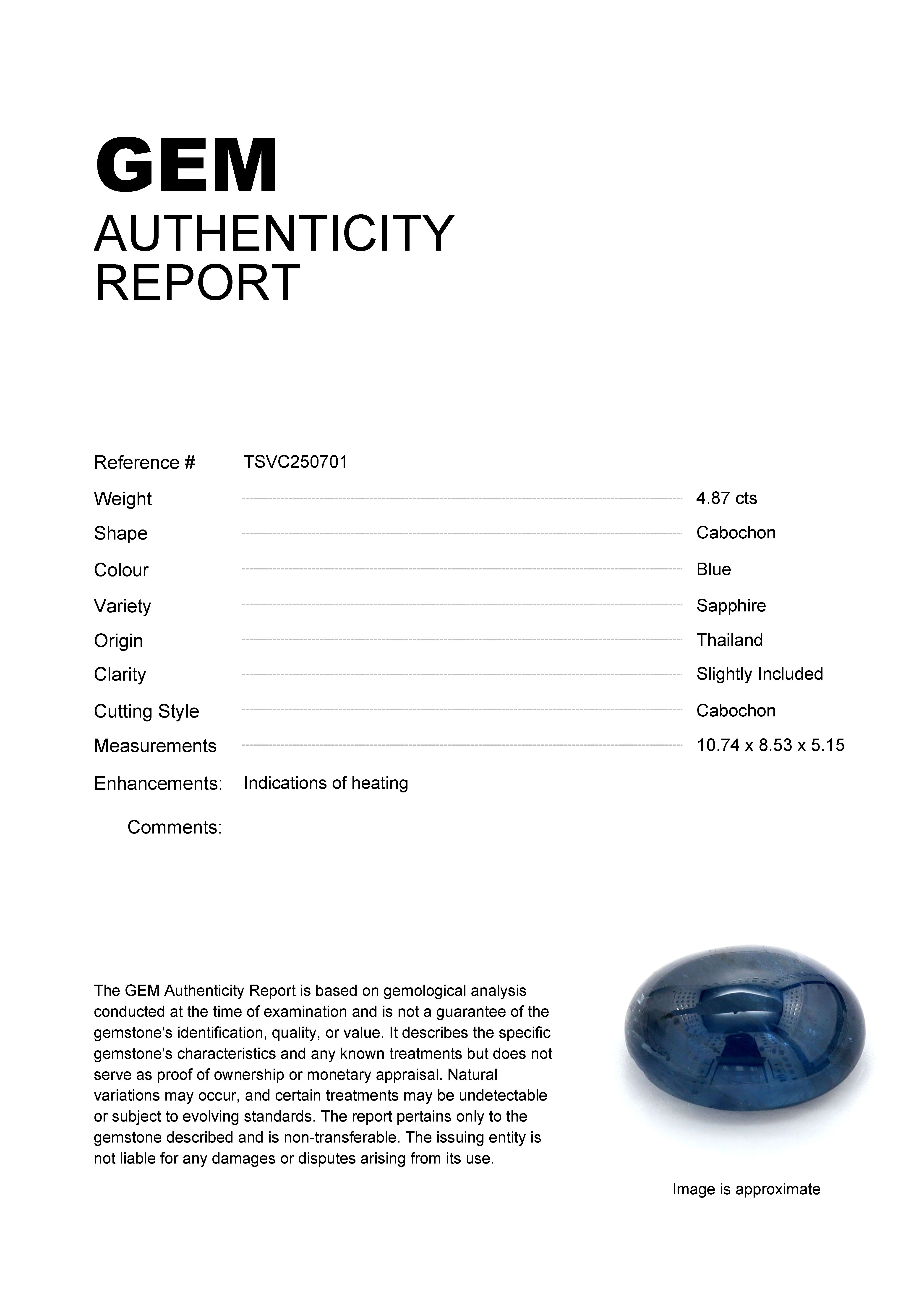 GEM: TSVC250701 Stock ID: TSVC2507014.87ct Blue Cabochon Thailand SapphireCarat: 4.87 ctType: SapphireCut: CabochonColour: BlueOrigin: ThailandComment: Heated10.74 x 8.53 x 5.15 mm