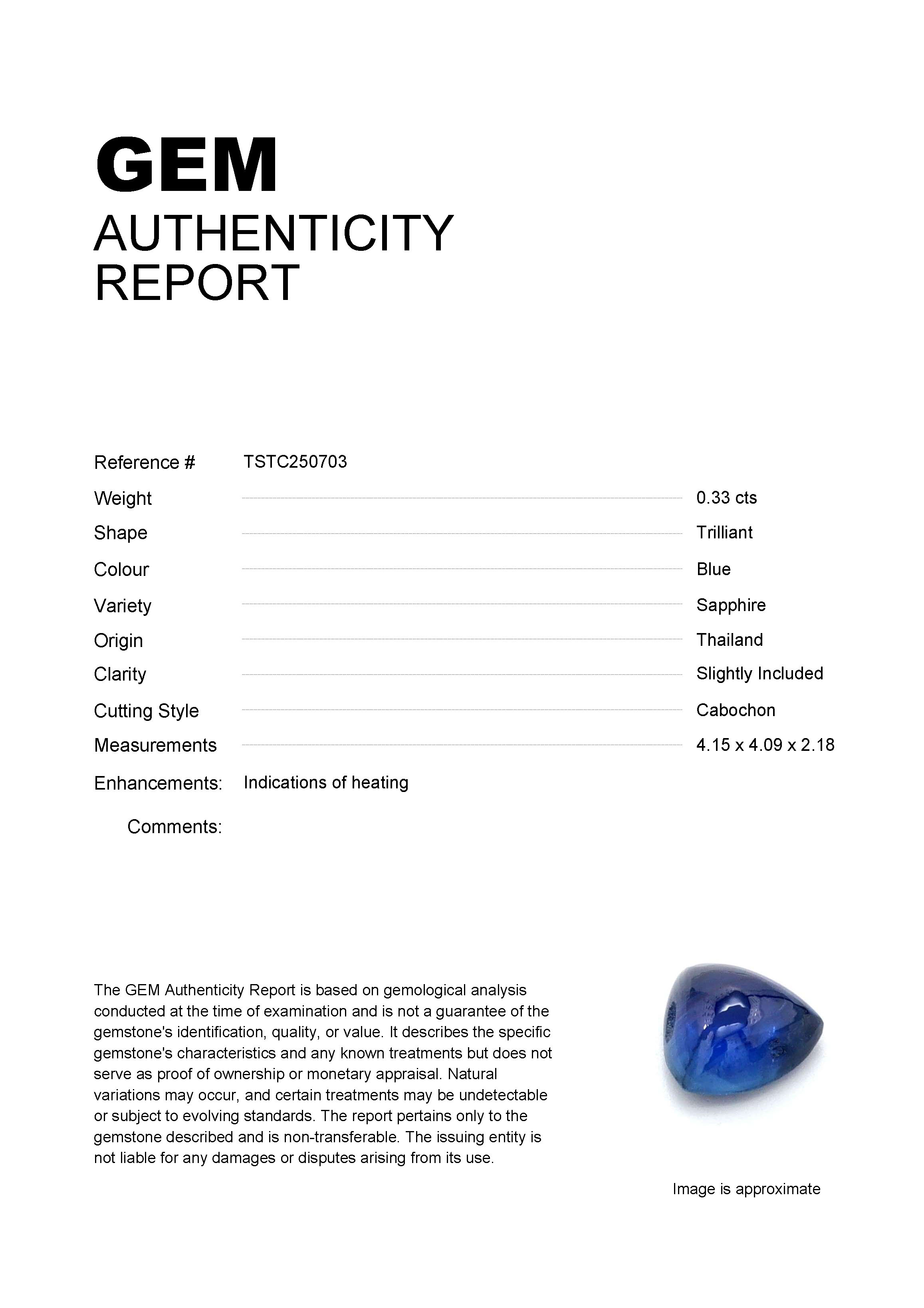 GEM: TSTC250703 Stock ID: TSTC2507030.33ct Blue Trilliant Thailand SapphireCarat: 0.33 ctType: SapphireCut: TrilliantColour: BlueOrigin: ThailandComment: Heated4.15 x 4.09 x 2.18 mm