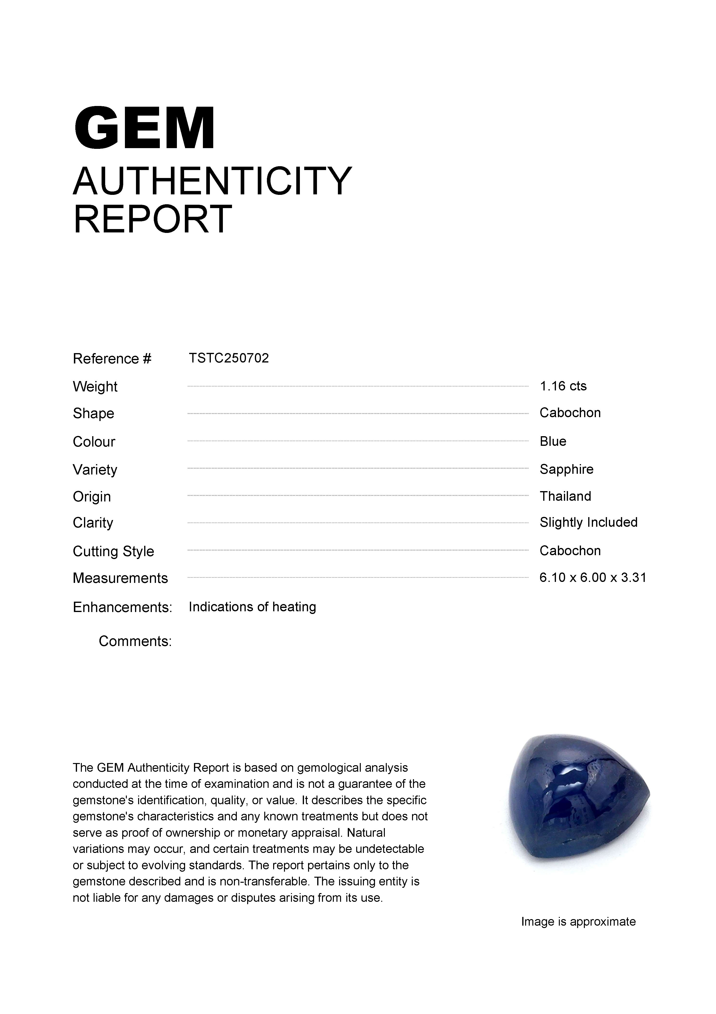 GEM: TSTC250702 Stock ID: TSTC2507021.16ct Blue Cabochon Thailand SapphireCarat: 1.16 ctType: SapphireCut: CabochonColour: BlueOrigin: ThailandComment: Heated6.10 x 6.00 x 3.31 mm