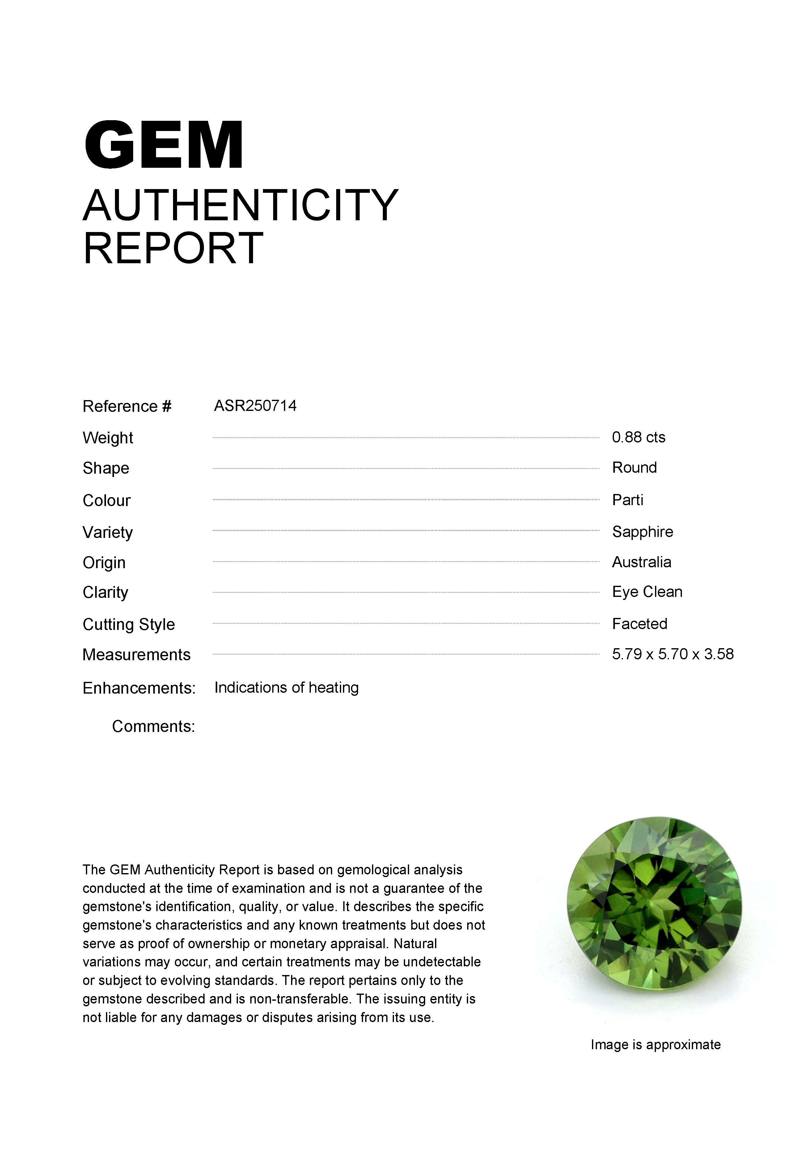 0.88ct Parti Round Australia SapphireCarat: 0.88 ctType: SapphireCut: RoundColour: PartiOrigin: AustraliaComment: Heated5.79 x 5.70 x 3.58 mm