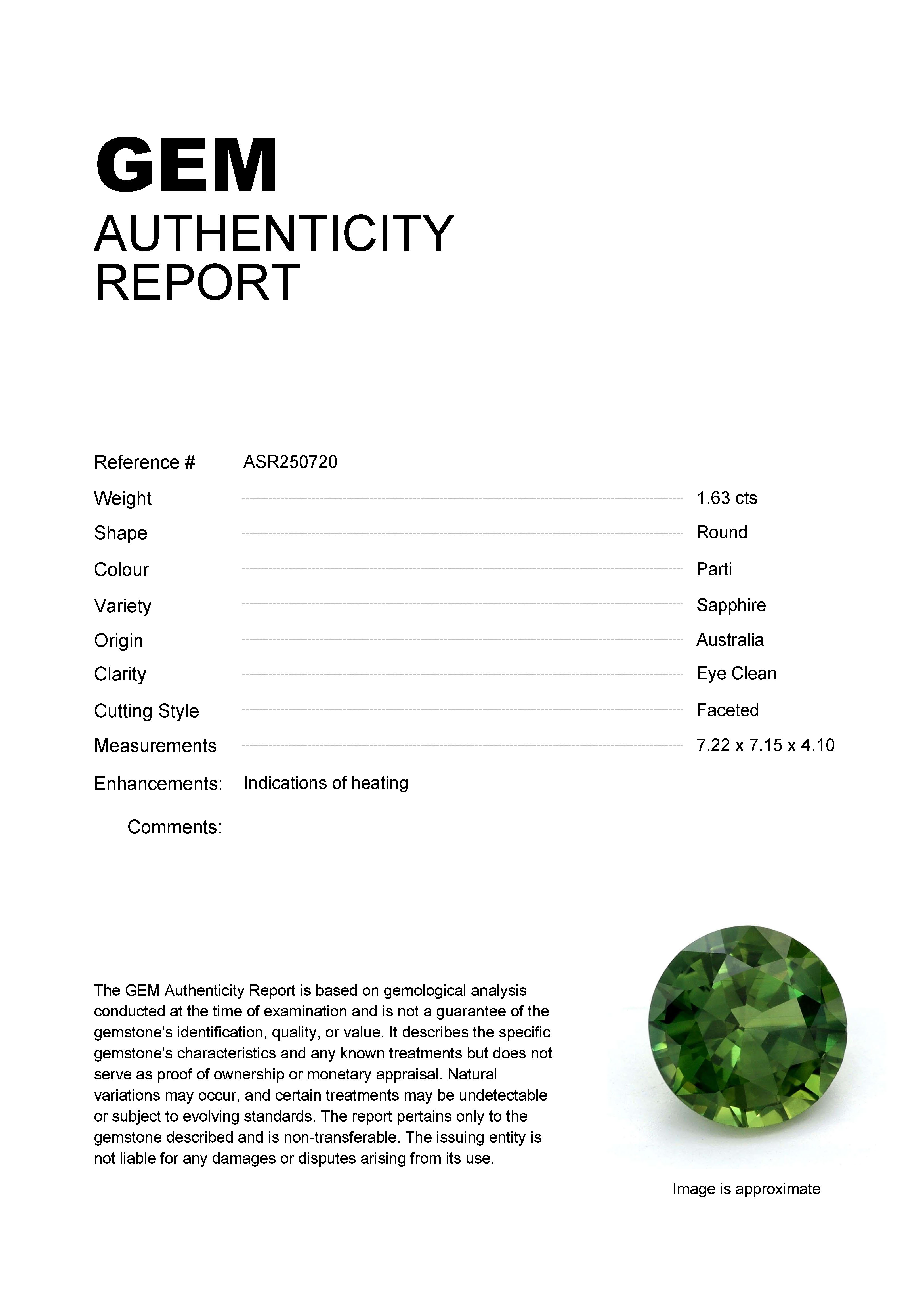 1.63ct Parti Round Australia SapphireCarat: 1.63 ctType: SapphireCut: RoundColour: PartiOrigin: AustraliaComment: Heated7.22 x 7.15 x 4.10 mm