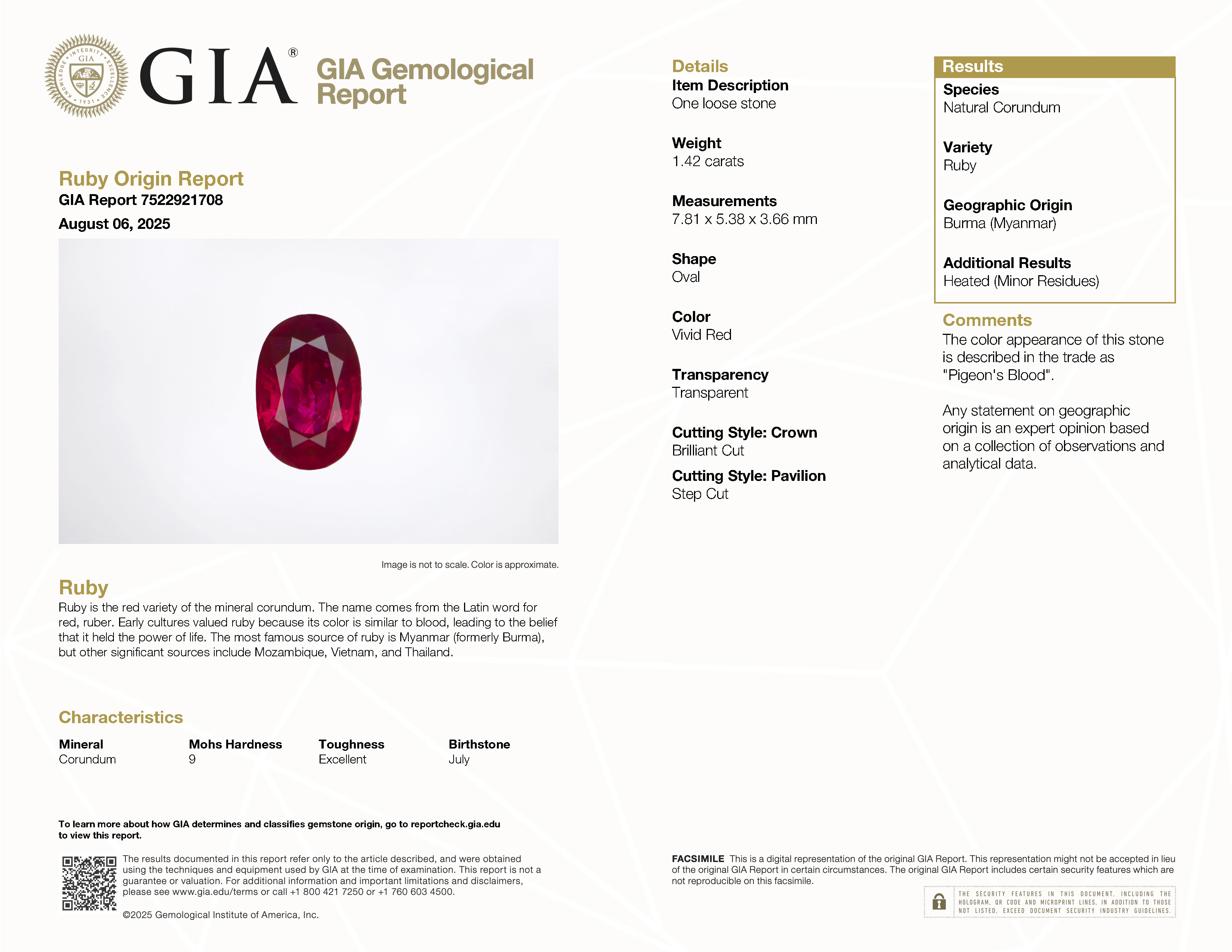 GIA: 7522921708 Stock ID: RV2506061.42ct Red Oval Myanmar (Burma) RubyCarat: 1.42 ctType: RubyCut: OvalColour: RedOrigin: Myanmar (Burma)Comment: Heated7.81 x 5.38 x 3.66 mm