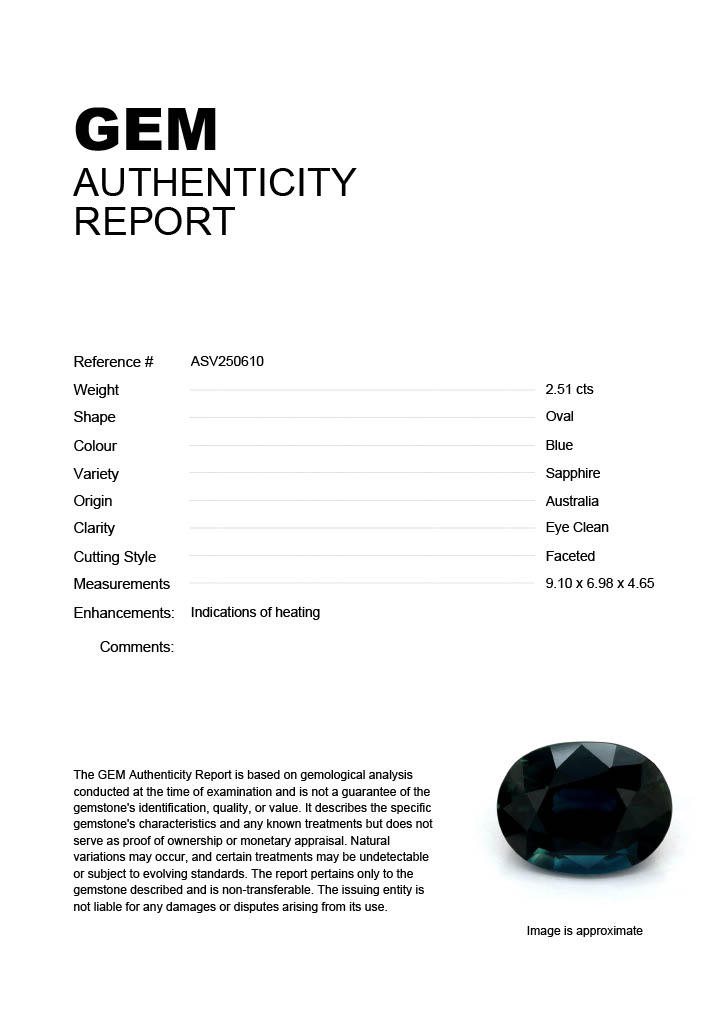 2.51ct Blue Oval Australia SapphireCarat: 2.51 ctType: SapphireCut: OvalColour: BlueOrigin: AustraliaComment: Heated9.10 x 6.98 x 4.65 mm