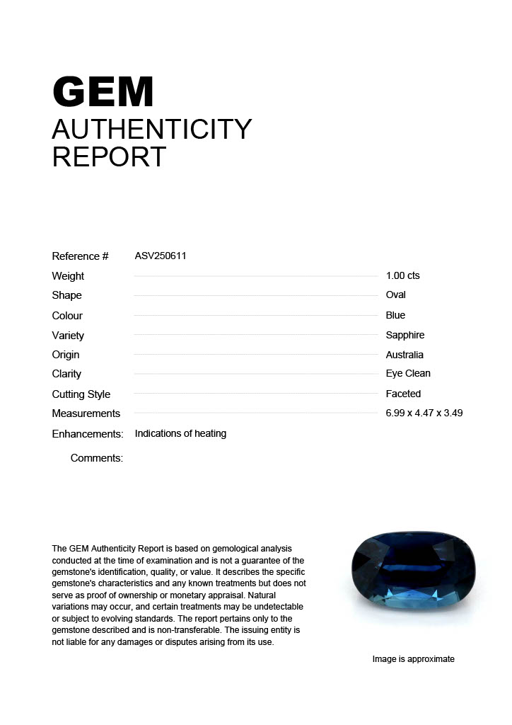 1.00ct Blue Oval Australia SapphireCarat: 1.00 ctType: SapphireCut: OvalColour: BlueOrigin: AustraliaComment: Heated6.99 x 4.47 x 3.49 mm