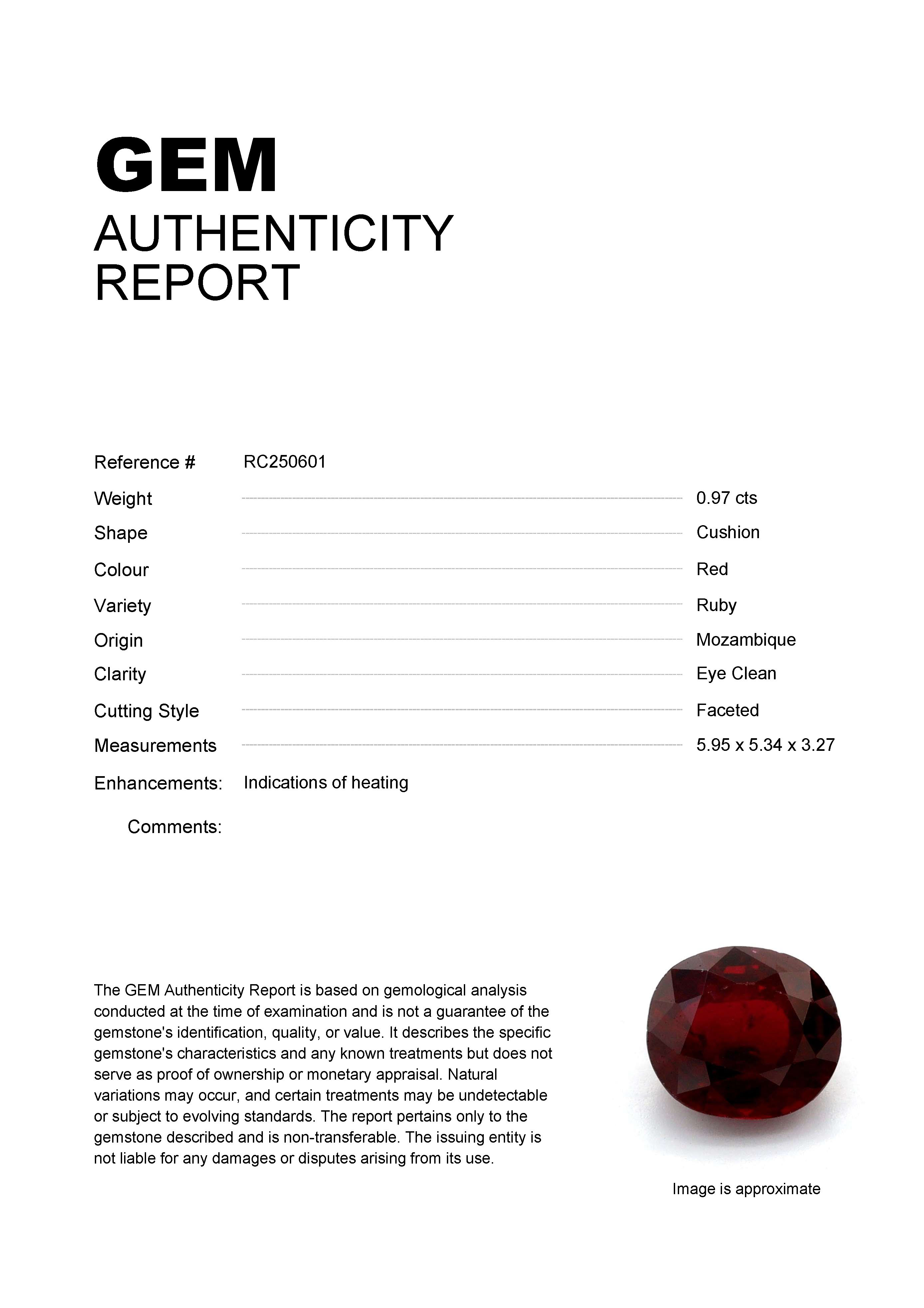 0.97ct Red Cushion Mozambique RubyCarat: 0.97 ctType: RubyCut: CushionColour: RedOrigin: MozambiqueComment: Heated5.95 x 5.34 x 3.27 mm
