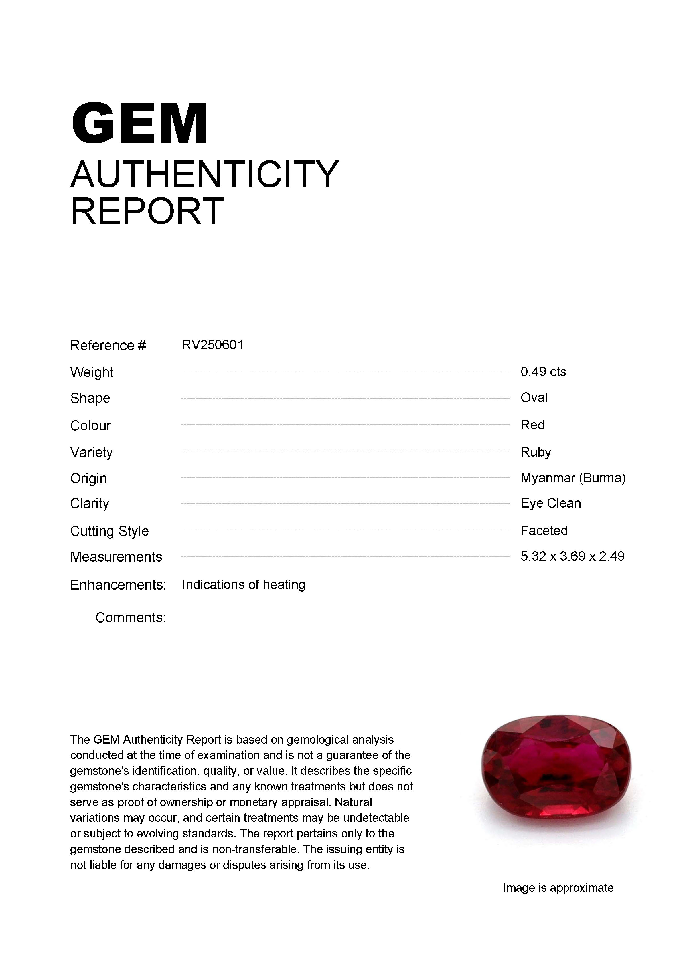 0.49ct Red Oval Myanmar (Burma) RubyCarat: 0.49 ctType: RubyCut: OvalColour: RedOrigin: Myanmar (Burma)Comment: Heated5.32 x 3.69 x 2.49 mm