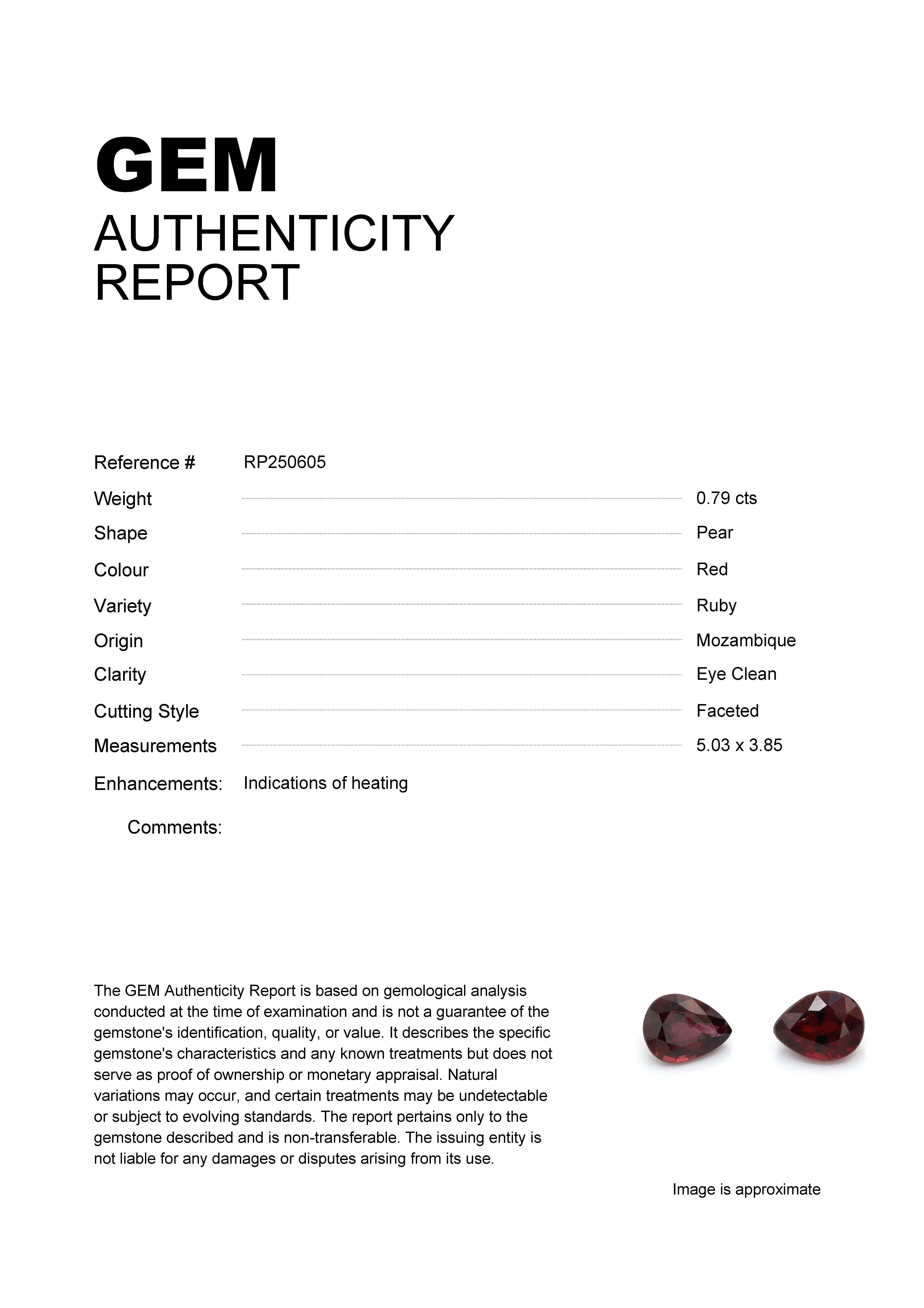 GEM: Matching Pair Stock ID: RP2506050.79ct Red Pear Mozambique RubyCarat: 0.79 ctType: RubyCut: PearColour: RedOrigin: MozambiqueComment: Heated5.03 x 3.85 mm