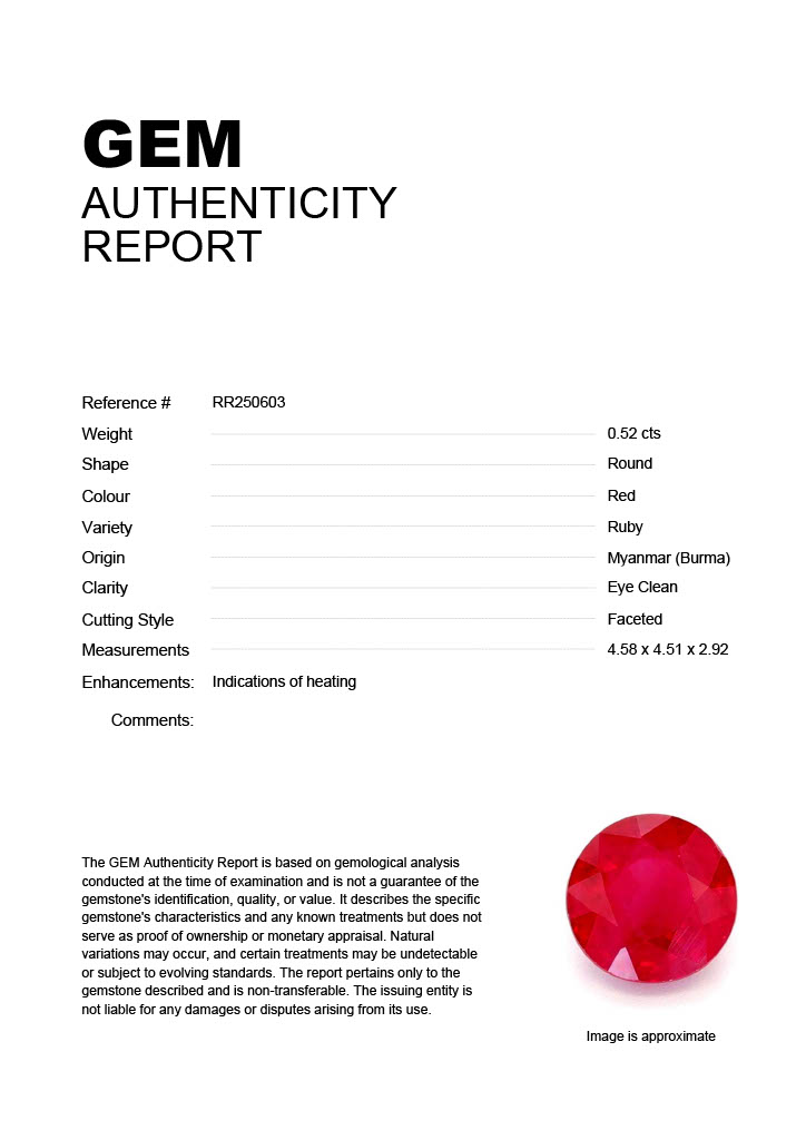 0.52ct Red Round Myanmar (Burma) RubyCarat: 0.52 ctType: RubyCut: RoundColour: RedOrigin: Myanmar (Burma)Comment: Heated4.58 x 4.50 x 2.97 mm