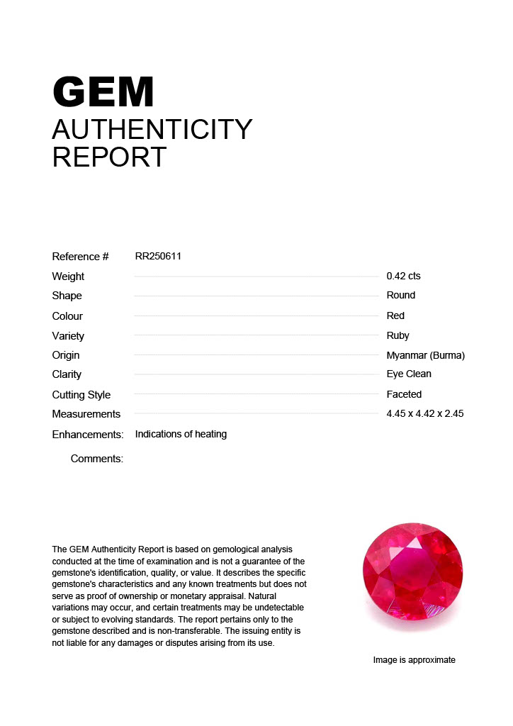 0.42ct Red Round Myanmar (Burma) RubyCarat: 0.42 ctType: RubyCut: RoundColour: RedOrigin: Myanmar (Burma)Comment: Heated4.45 x 4.42 x 2.45 mm