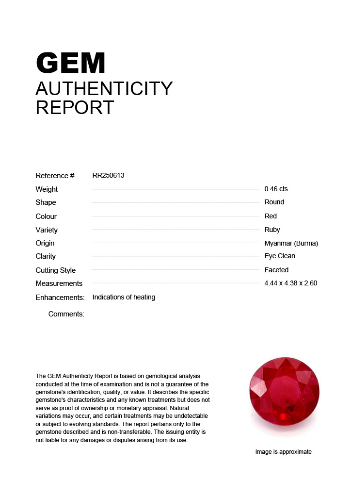 0.46ct Red Round Myanmar (Burma) RubyCarat: 0.46 ctType: RubyCut: RoundColour: RedOrigin: Myanmar (Burma)Comment: Heated4.44 x 4.38 x 2.60 mm