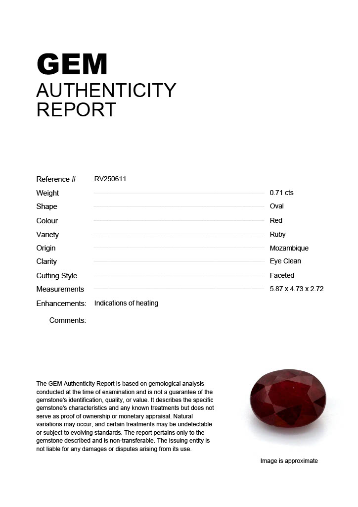 0.71ct Red Oval Mozambique RubyCarat: 0.71 ctType: RubyCut: OvalColour: RedOrigin: MozambiqueComment: Heated5.87 x 4.73 x 2.72 mm