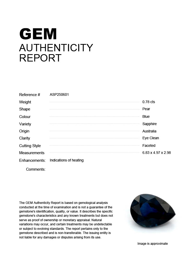 0.78ct Blue Pear Australia SapphireCarat: 0.78 ctType: SapphireCut: PearColour: BlueOrigin: AustraliaComment: Heated6.83 x 4.97 x 2.98 mm