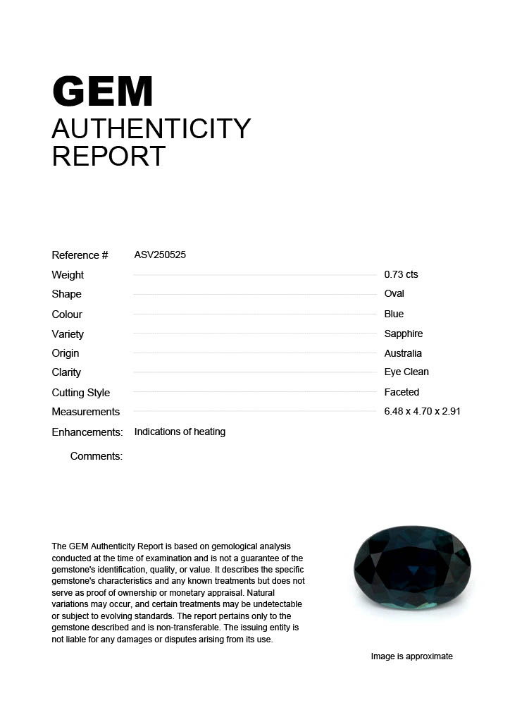 0.73ct Blue Oval Australia SapphireCarat: 0.73 ctType: SapphireCut: OvalColour: BlueOrigin: AustraliaComment: Heated6.48 x 4.70 x 2.91 mm