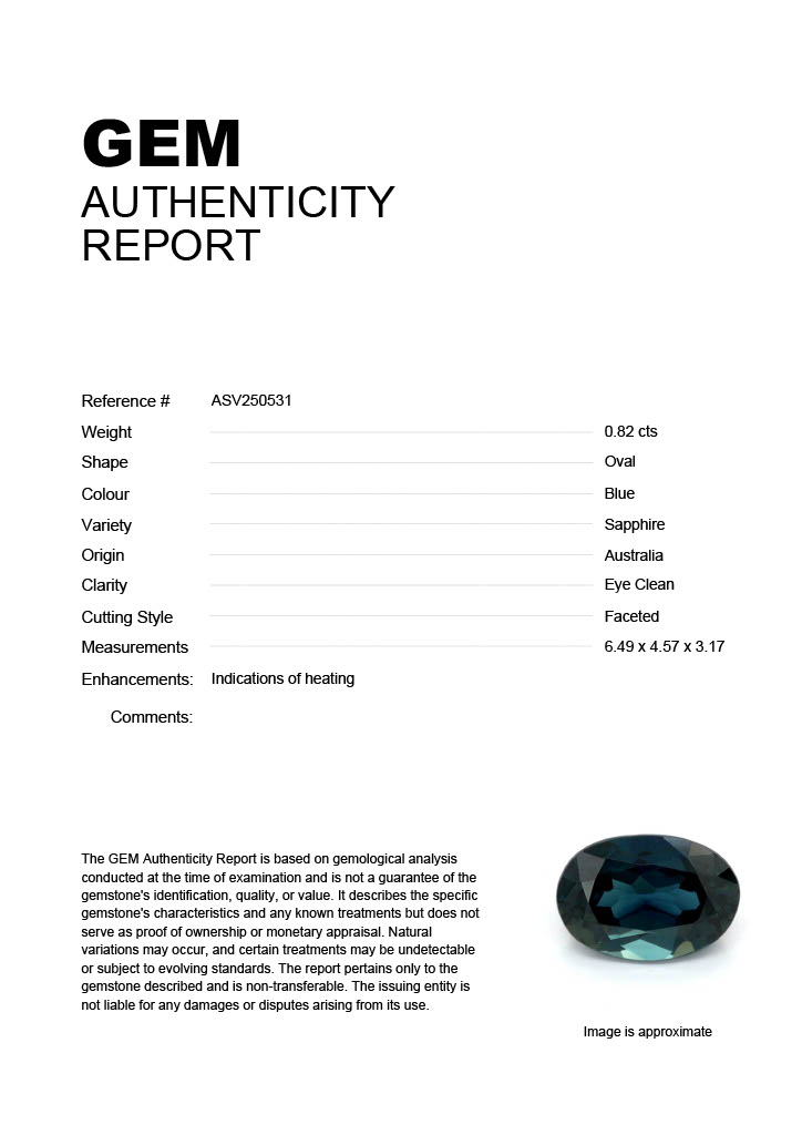0.82ct Blue Oval Australia SapphireCarat: 0.82 ctType: SapphireCut: OvalColour: BlueOrigin: AustraliaComment: Heated6.49 x 4.57 x 3.17 mm