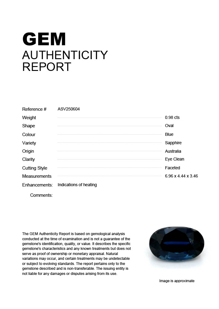 0.98ct Blue Oval Australia SapphireCarat: 0.98 ctType: SapphireCut: OvalColour: BlueOrigin: AustraliaComment: Heated6.96 x 4.44 x 3.46 mm