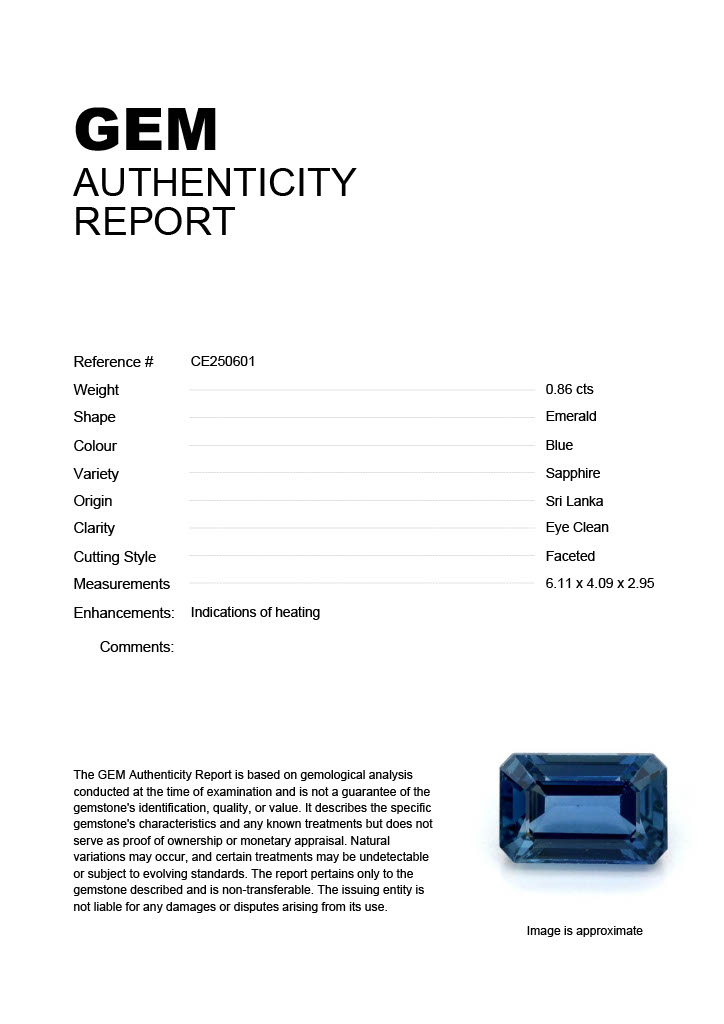 0.86ct Blue Emerald Sri Lanka SapphireCarat: 0.86 ctType: SapphireCut: EmeraldColour: BlueOrigin: Sri LankaComment: Heated6.11 x 4.09 x 2.95 mm