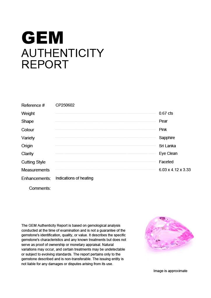 0.67ct Pink Pear Sri Lanka SapphireCarat: 0.67 ctType: SapphireCut: PearColour: PinkOrigin: Sri LankaComment: Heated6.03 x 4.12 x 3.33 mm