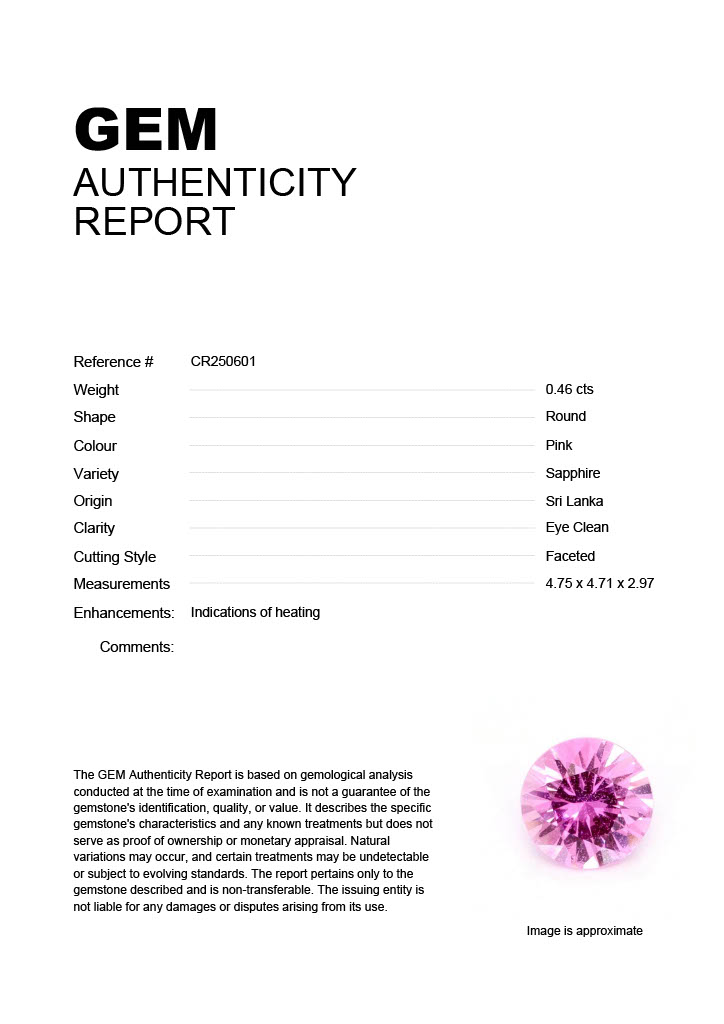 0.46ct Pink Round Sri Lanka SapphireCarat: 0.46 ctType: SapphireCut: RoundColour: PinkOrigin: Sri LankaComment: Heated4.75 x 4.71 x 2.97 mm